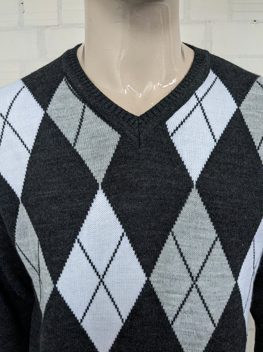 Magione di lana l'Onn vintage con scollo a V. Stampa argyle bianca grigia. Taglia XL. Lana al 100%.