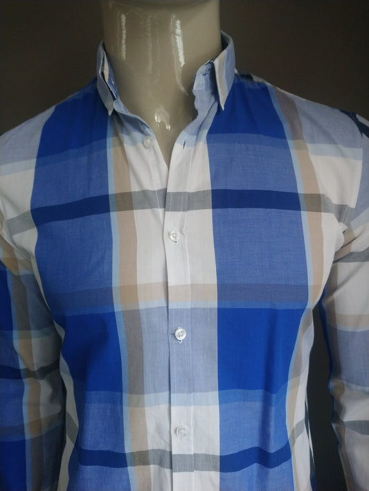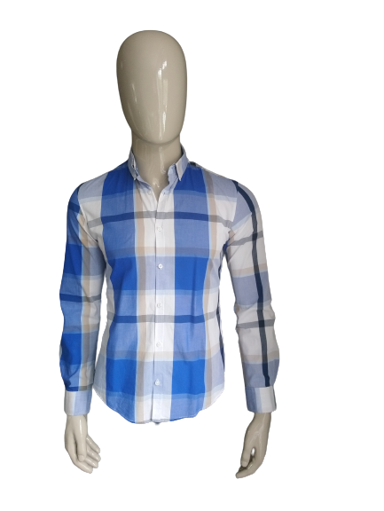 Abbiamo modellato la camicia. A scacchi bianchi marrone nero blu. Taglia M.