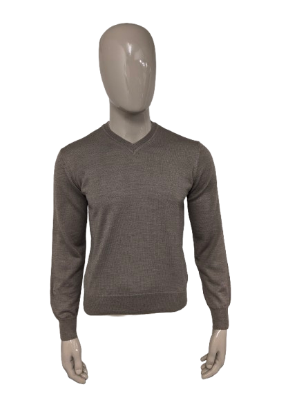 Magione vintage di lana Leaureat con scollo a V. Beige Green Brown Colorato. Dimensione L. 50% lana.