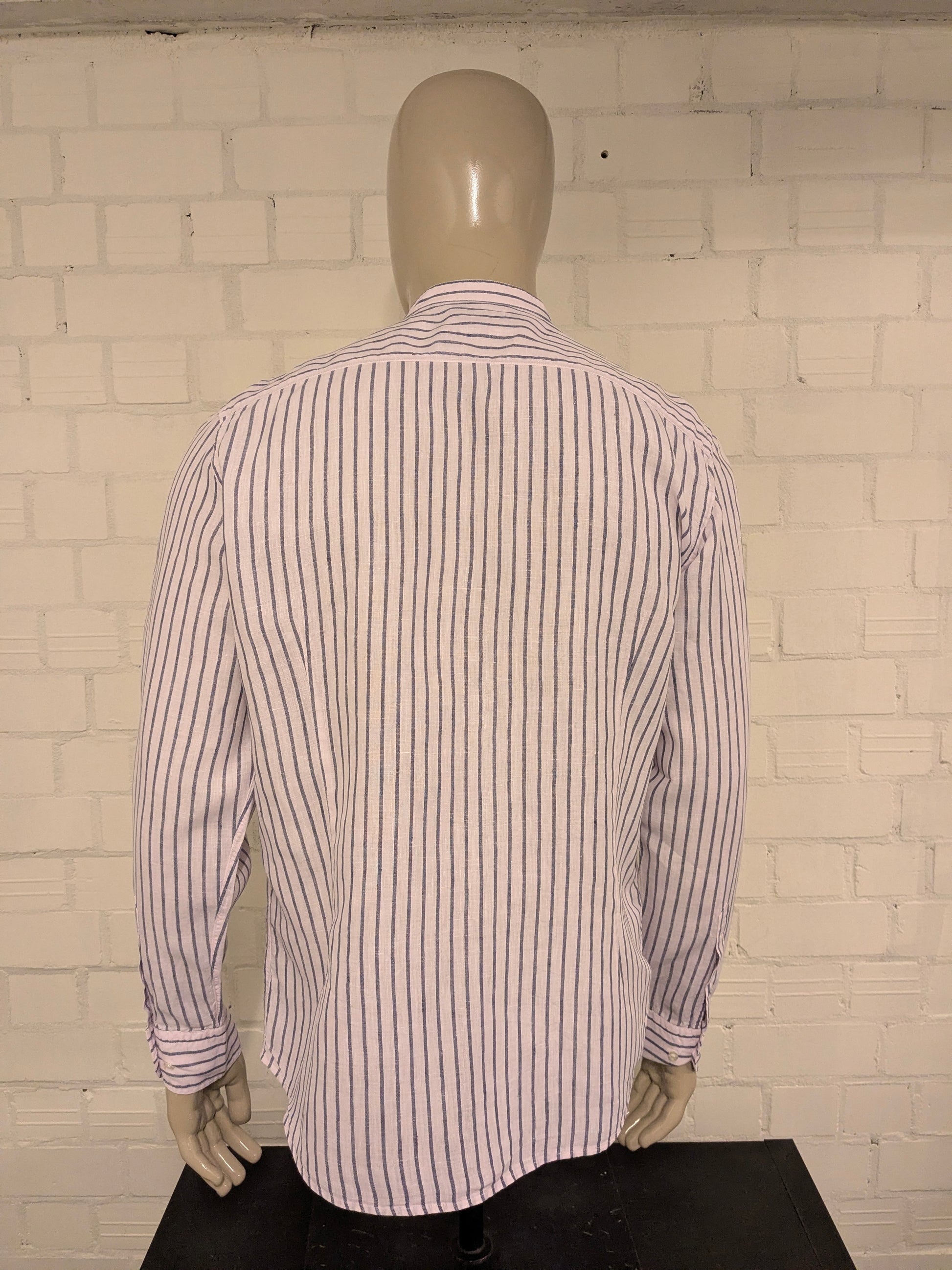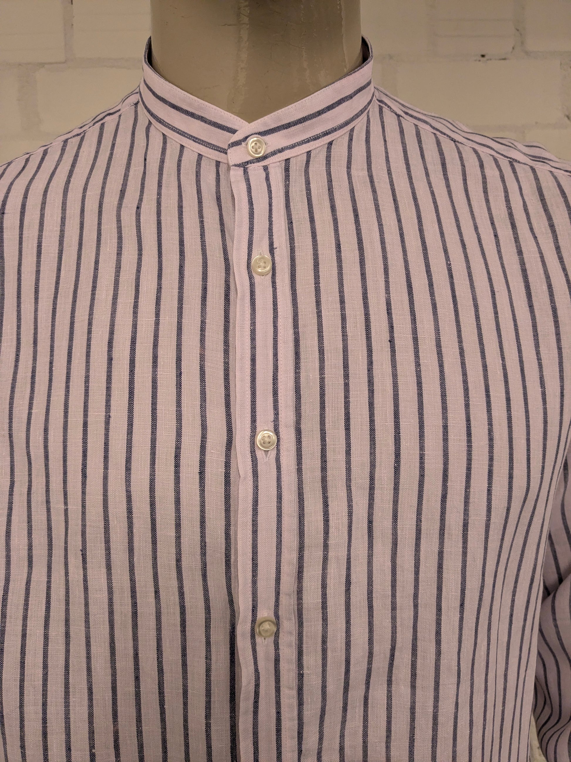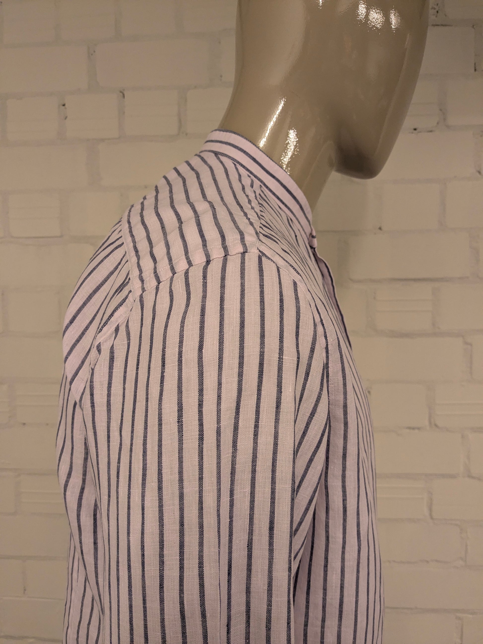 Massimo Dutti Linnen overhemd met mao, boeren-, korte kraag. Licht Roze Blauw gestreept. Maat XL.