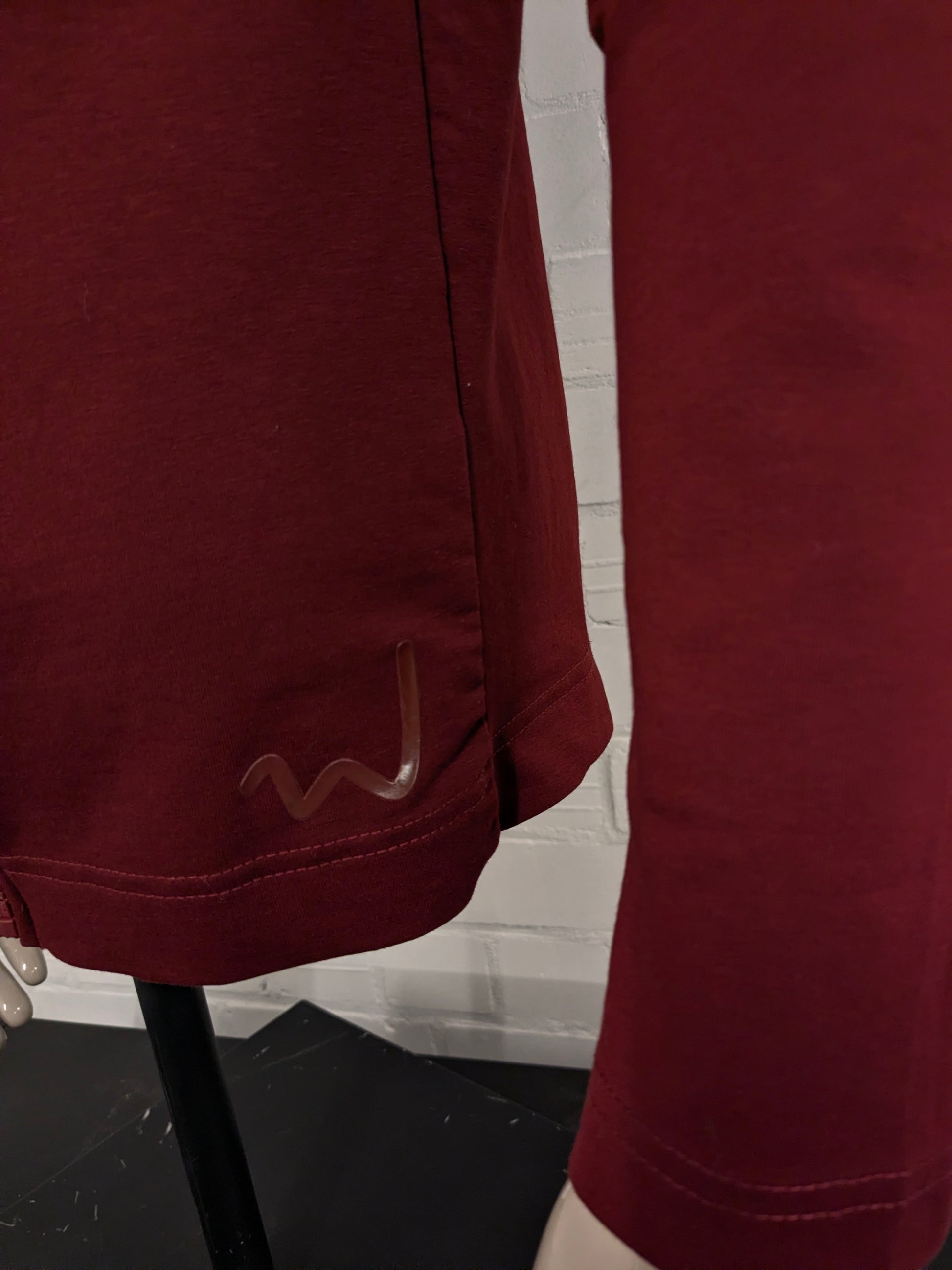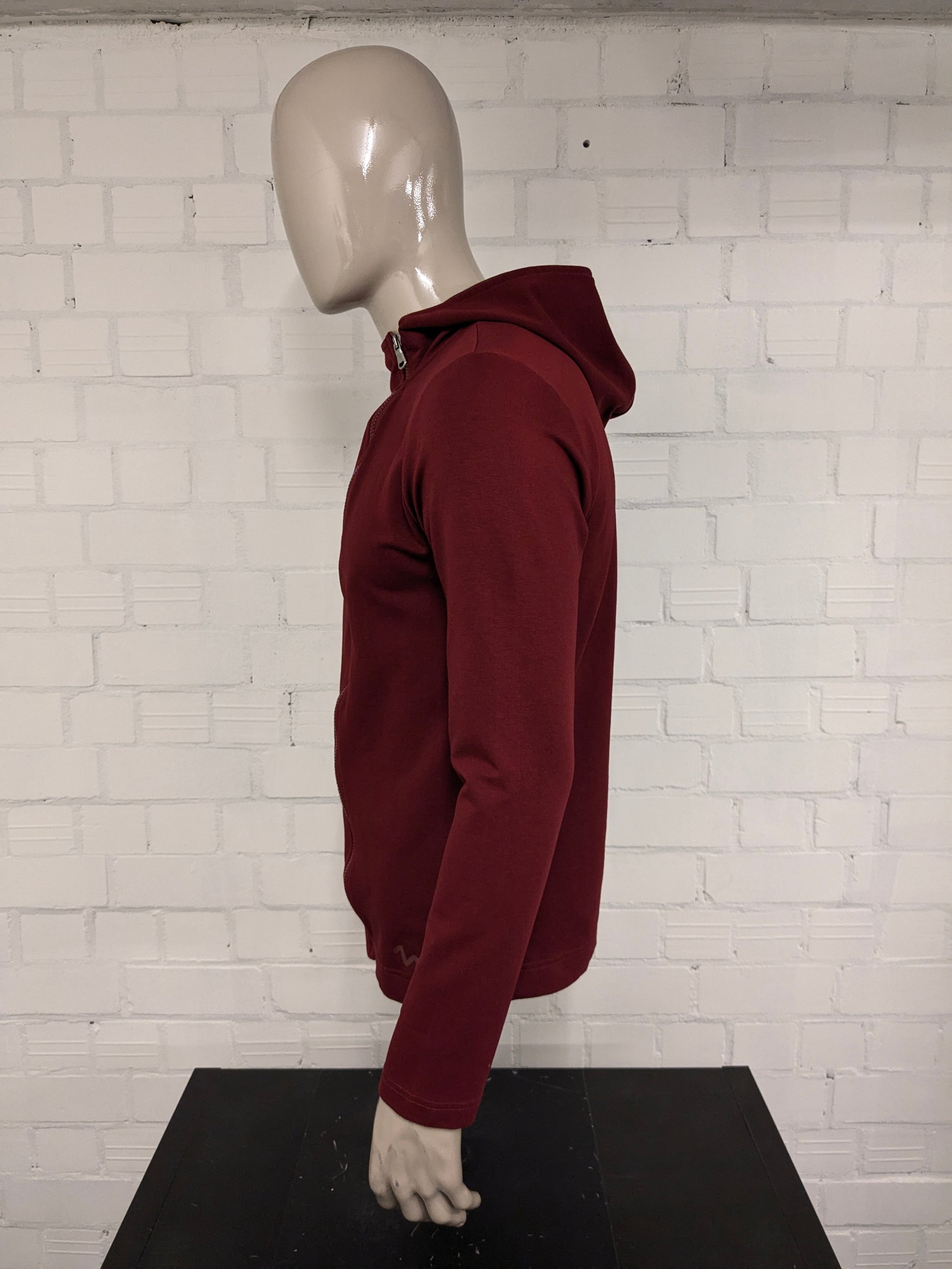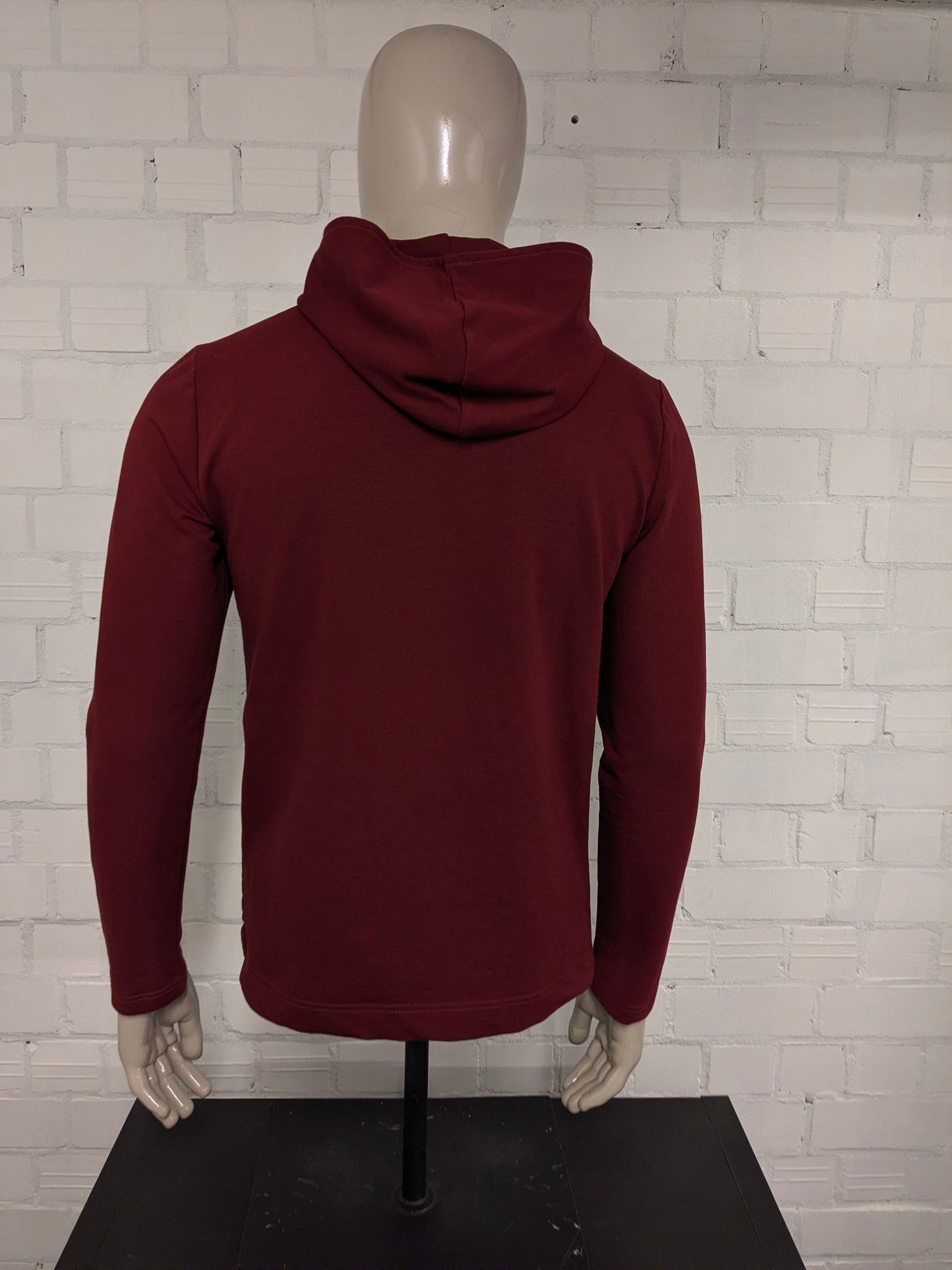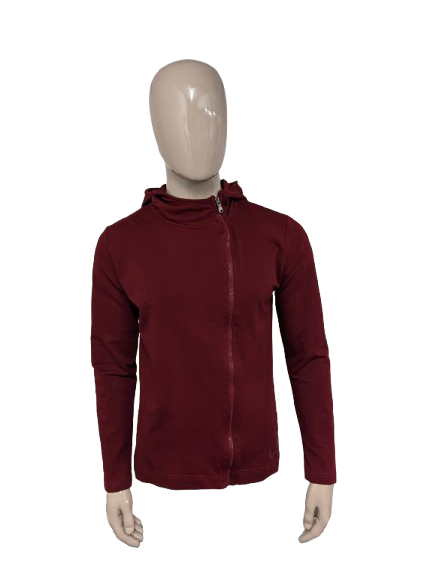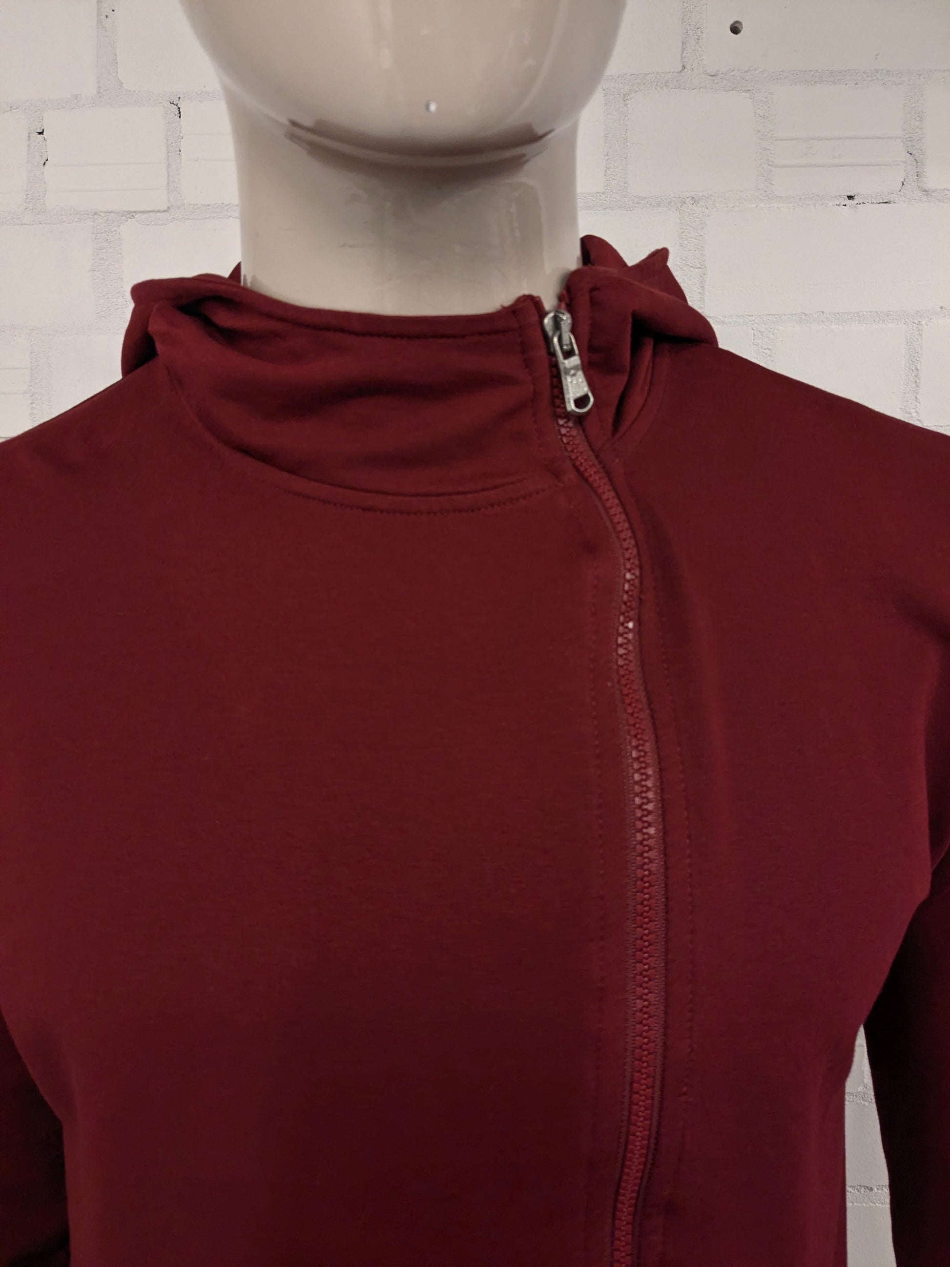 Pure White vest met capuchon en asymmetrische rits. Donker Rood gekleurd. Maat L.