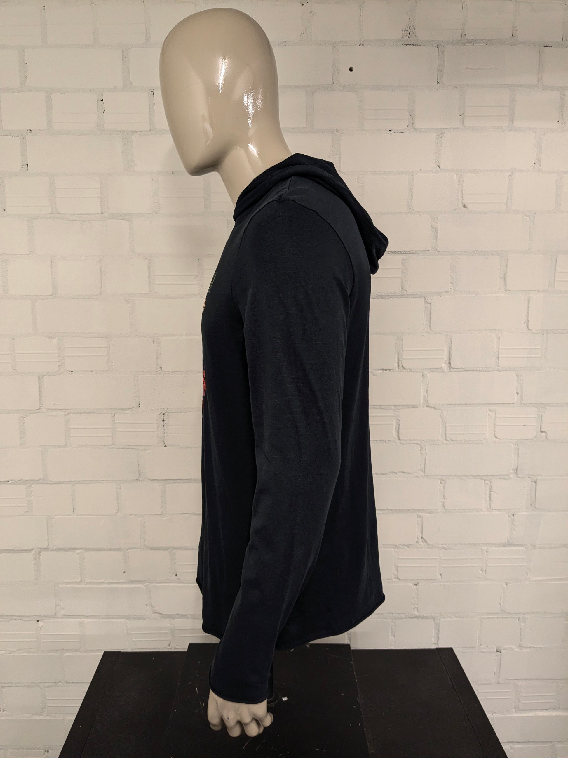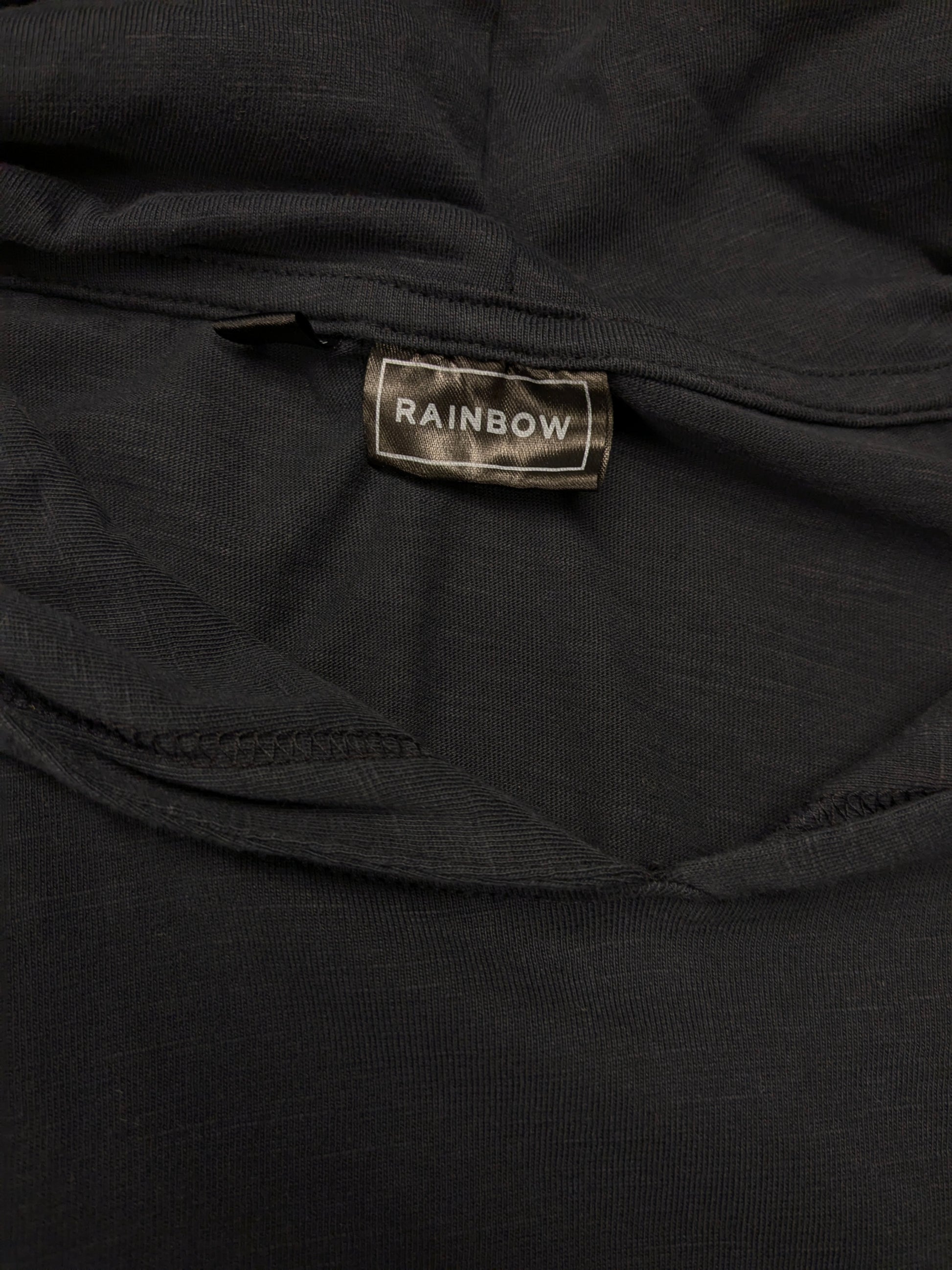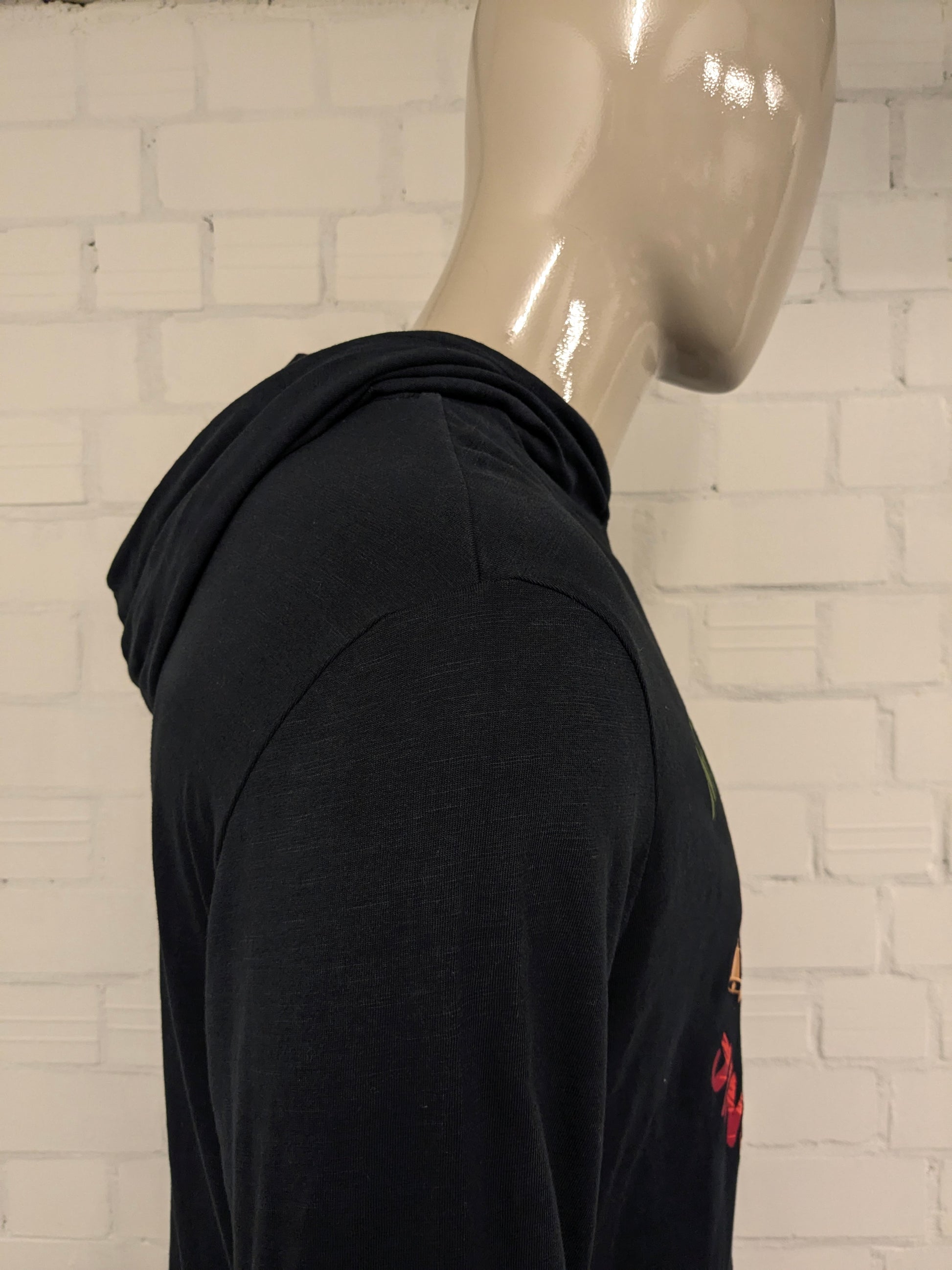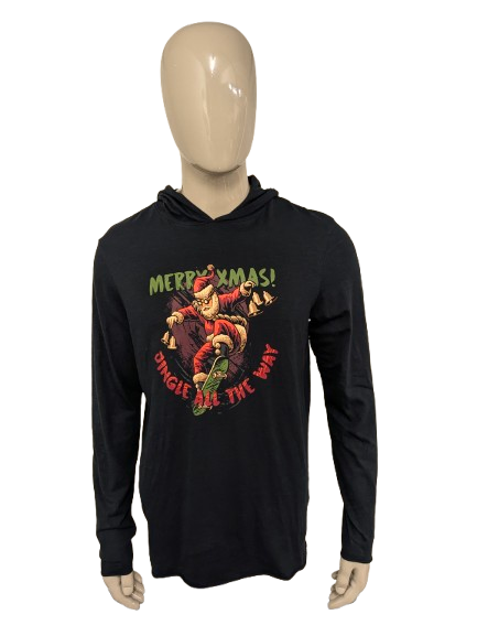 Felpa sottile con cappuccio arcobaleno "Merry XMas". Nero con stampa. Taglia L.
