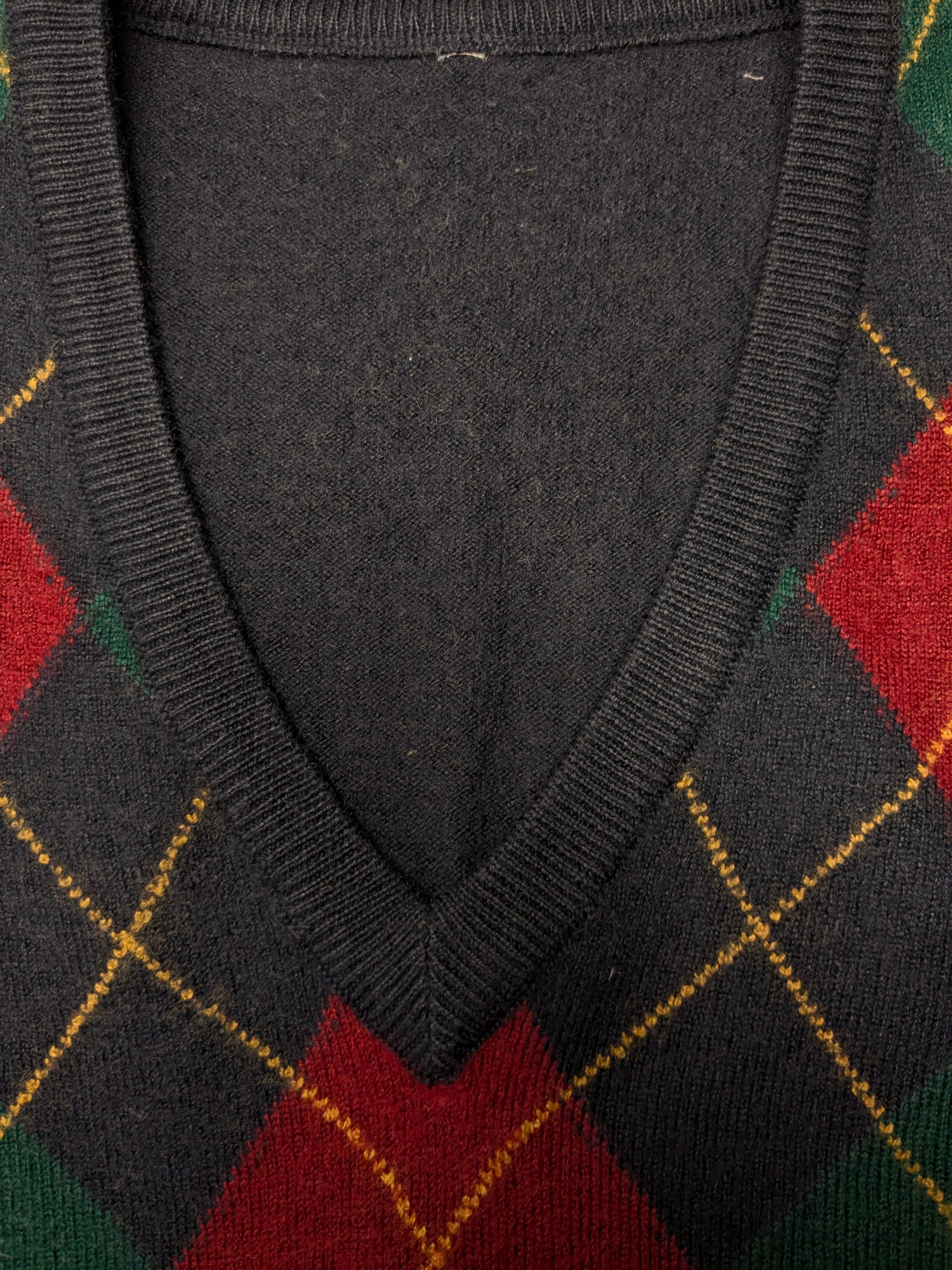 Maglione vintage in lana merino con scollo a V. Motivo argyle giallo verde rosso. Dimensione L. 50% lana.