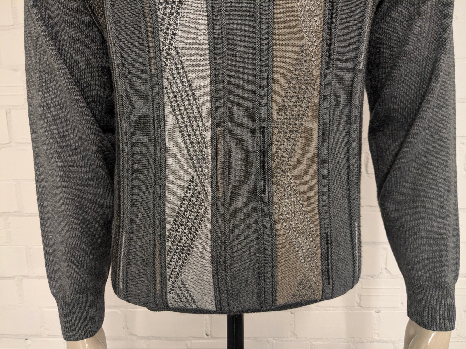 Maglione vintage in lana Trade Wind con scollo a V. Colore grigio kaki. Taglia M. 30% Lana.