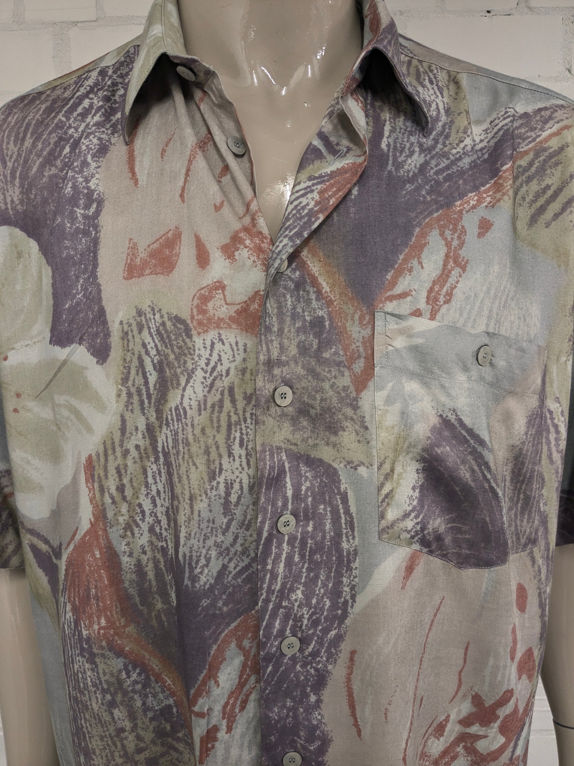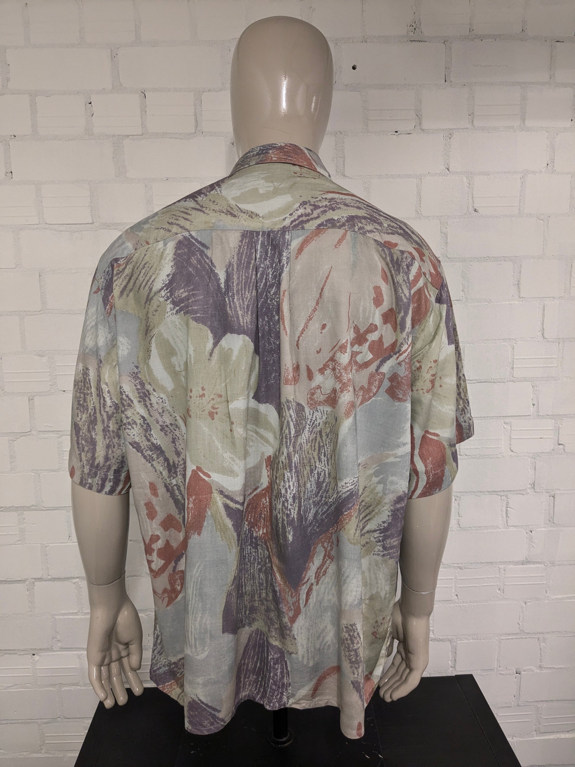 Vintage 80-90's Vasus & Sons overhemd korte mouw. Groen Paars Rode print. Maat 3XL / XXXL. Viscose.