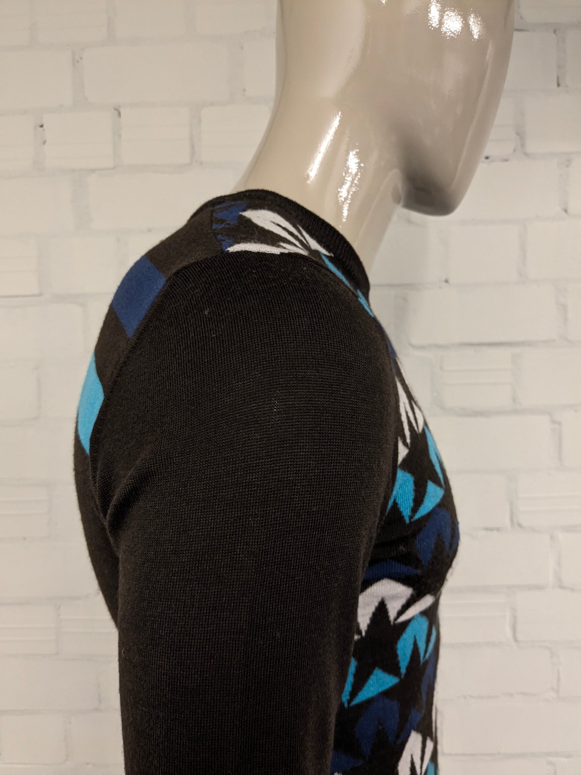 Energie Wollen trui met V-Hals. Bruin Blauw Wit motief. Maat S. 50% Wol.