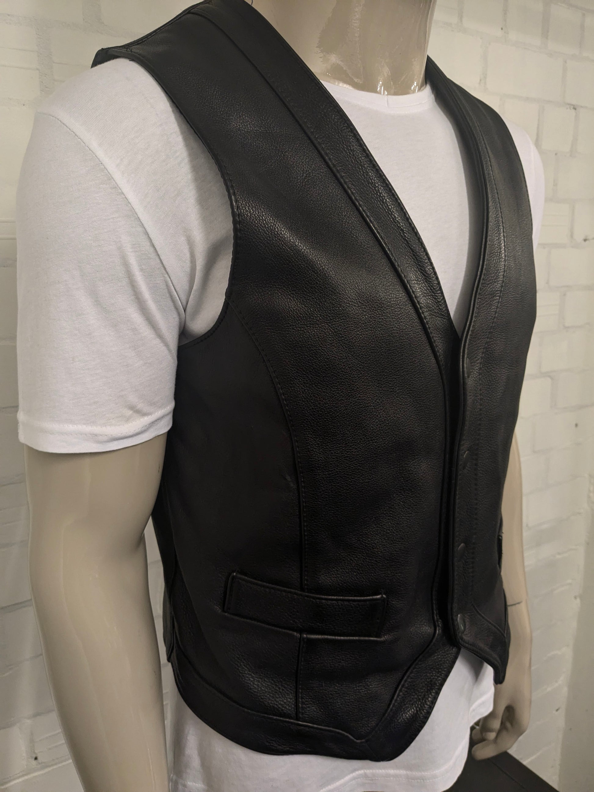 Ly dubbelzijdig leren gilet met drukknopen. Zwart gekleurd. 1 binnenzak. Maat L.