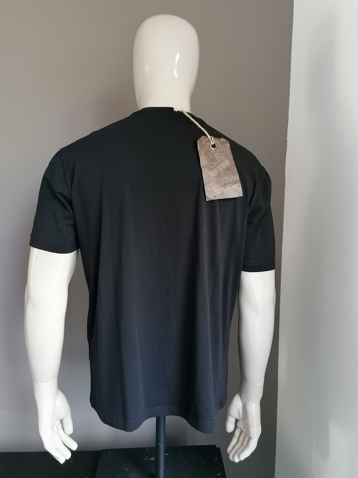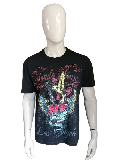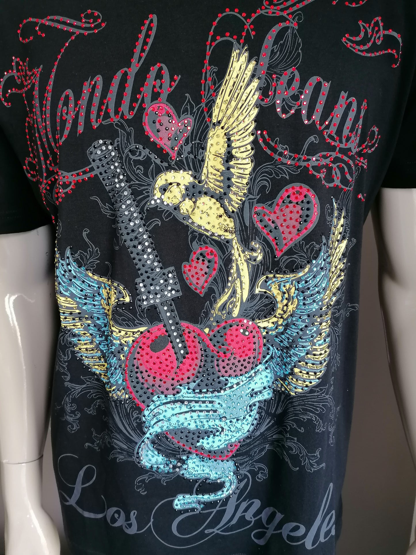 Mondo Shirt. Zwart met opdruk en steentjes. Maat XXL. Nieuw!! Op het maatlabel staat 3XL, maar gezien de afmetingen draagt hij als een maat XXL. Zie afmetingen: