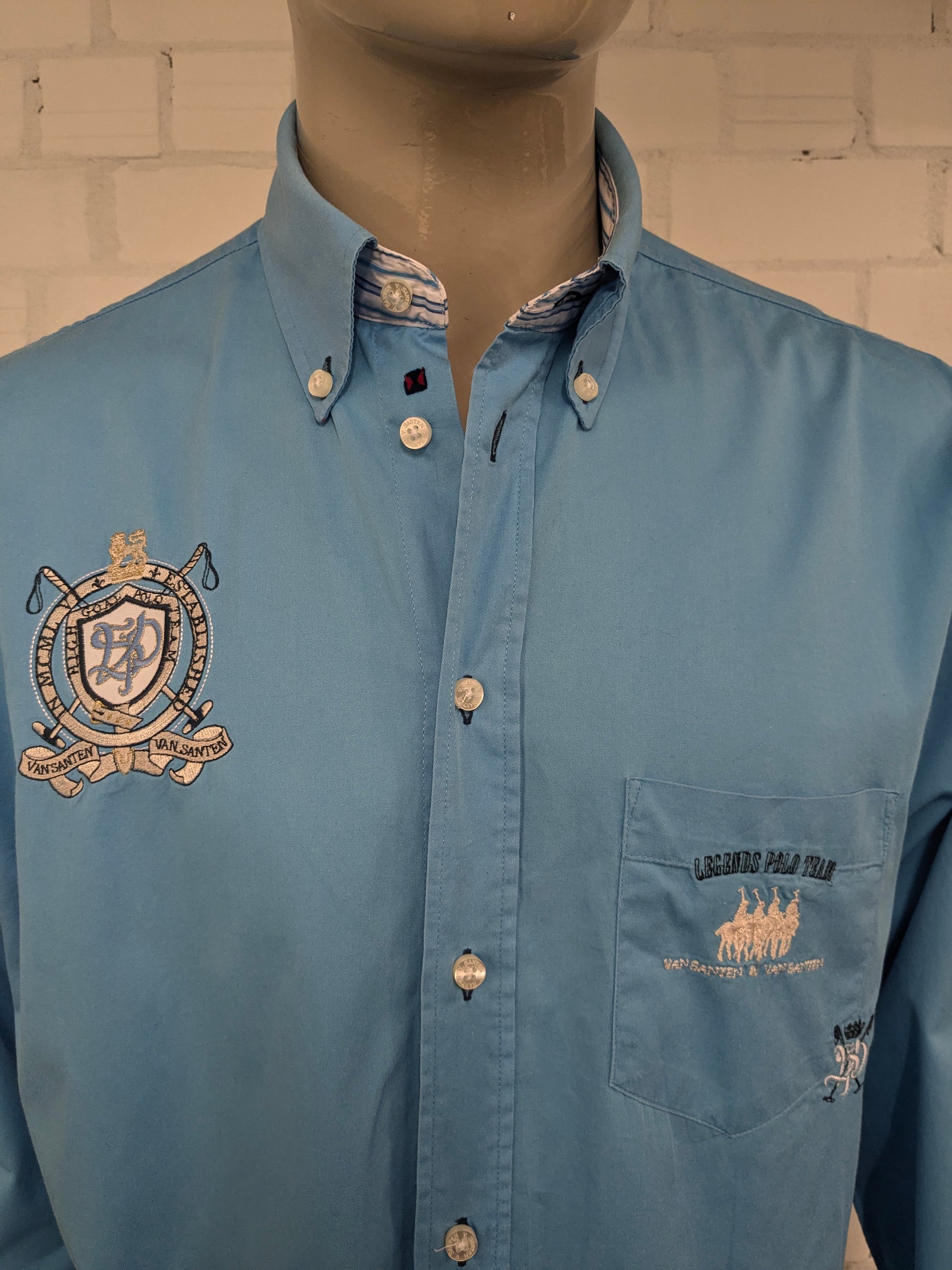 Van Santen & Van Santen overhemd. Blauw met verschillende applicaties. Maat XL.