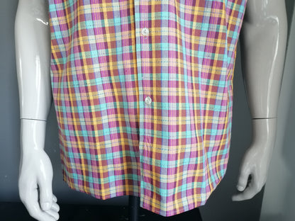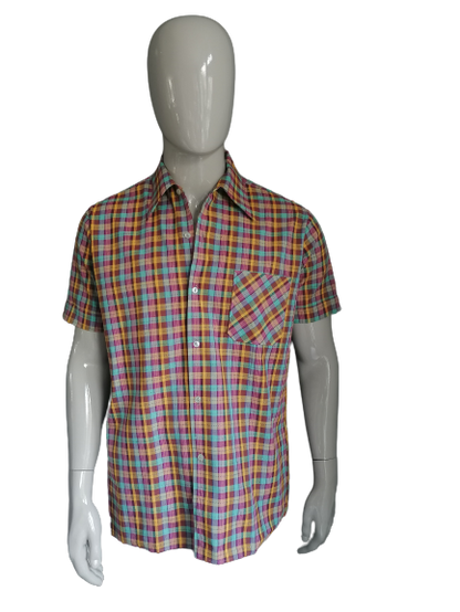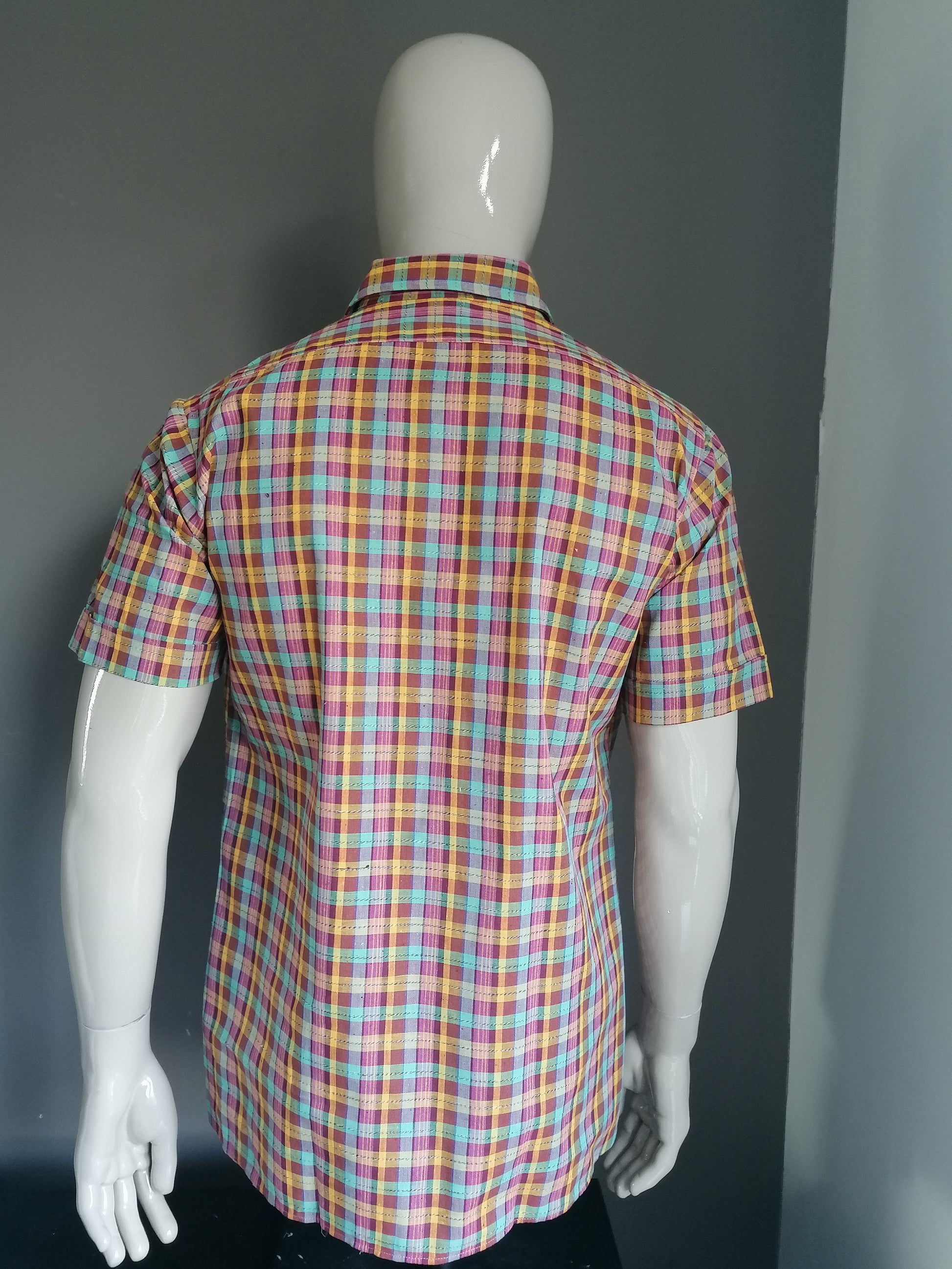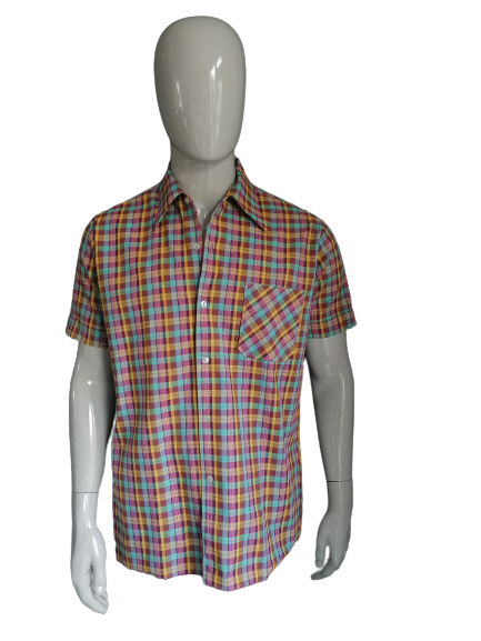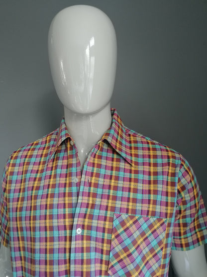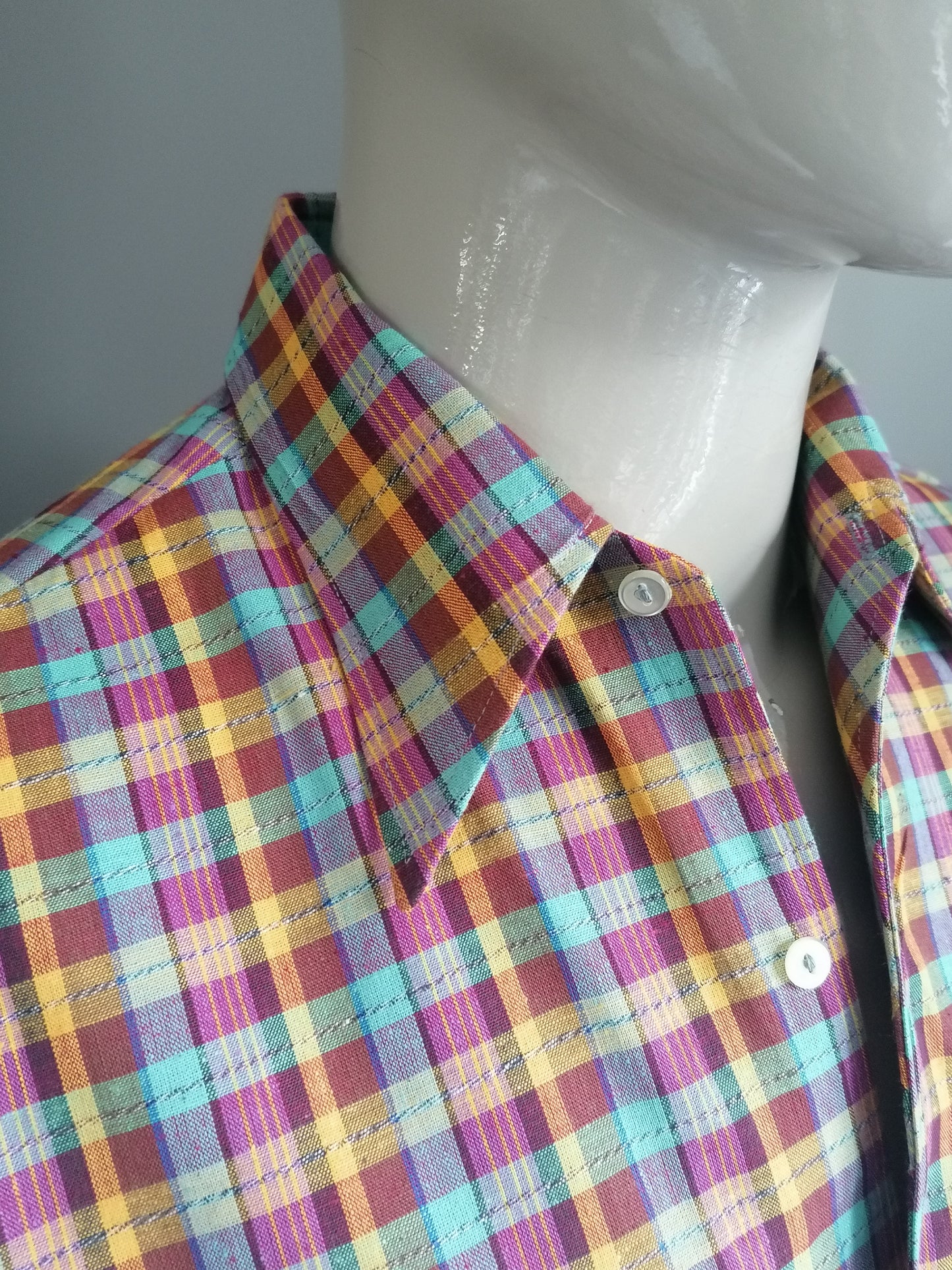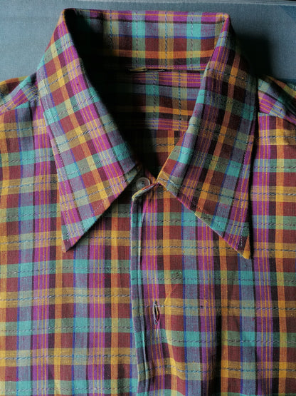 Vintage 70's overhemd korte mouw. Puntkraag. Geel Paars Bruin. Maat L.