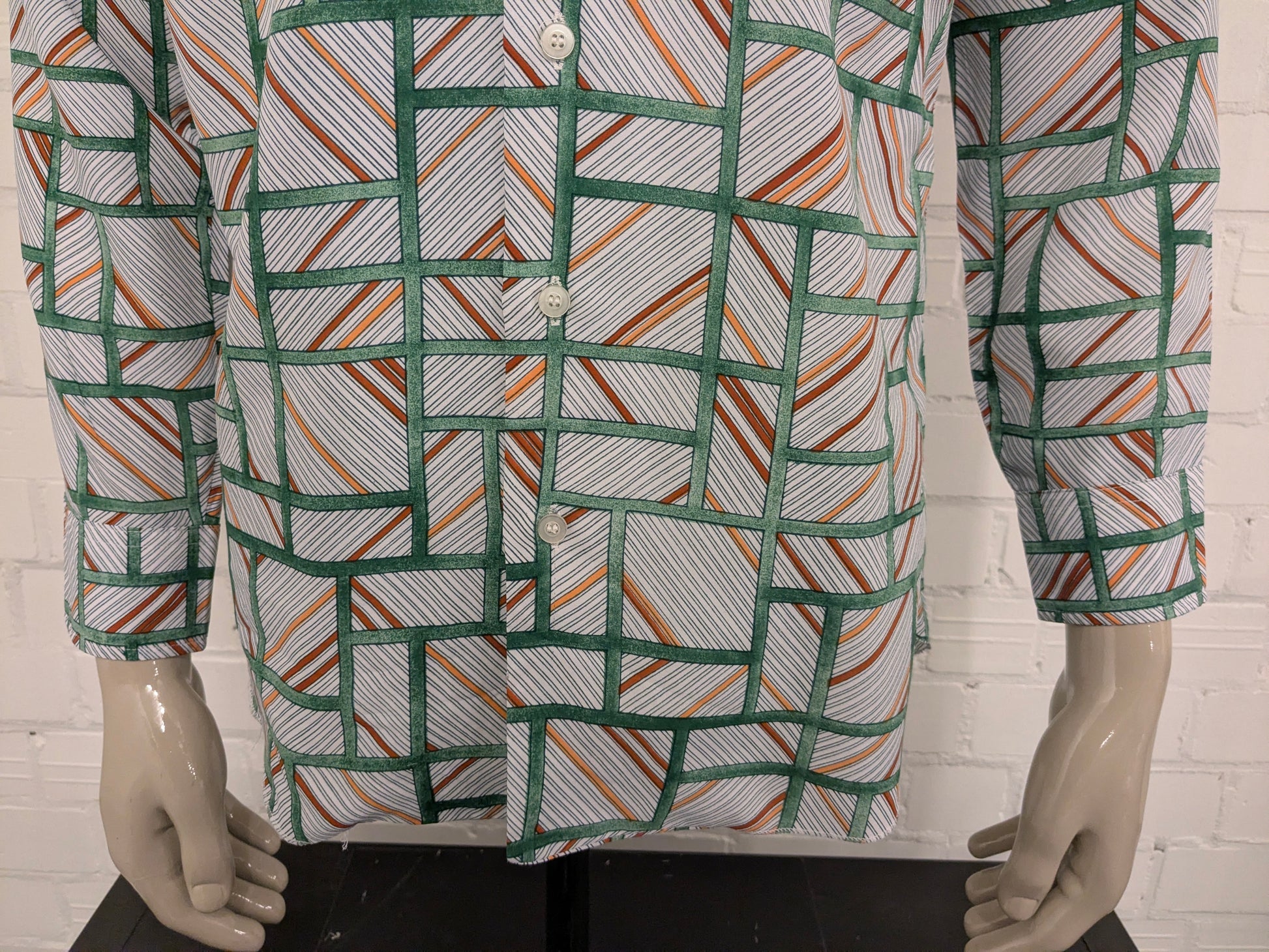 Vintage 70's overhemd met puntkraag. Groen Oranje Bruine print. Maat L.