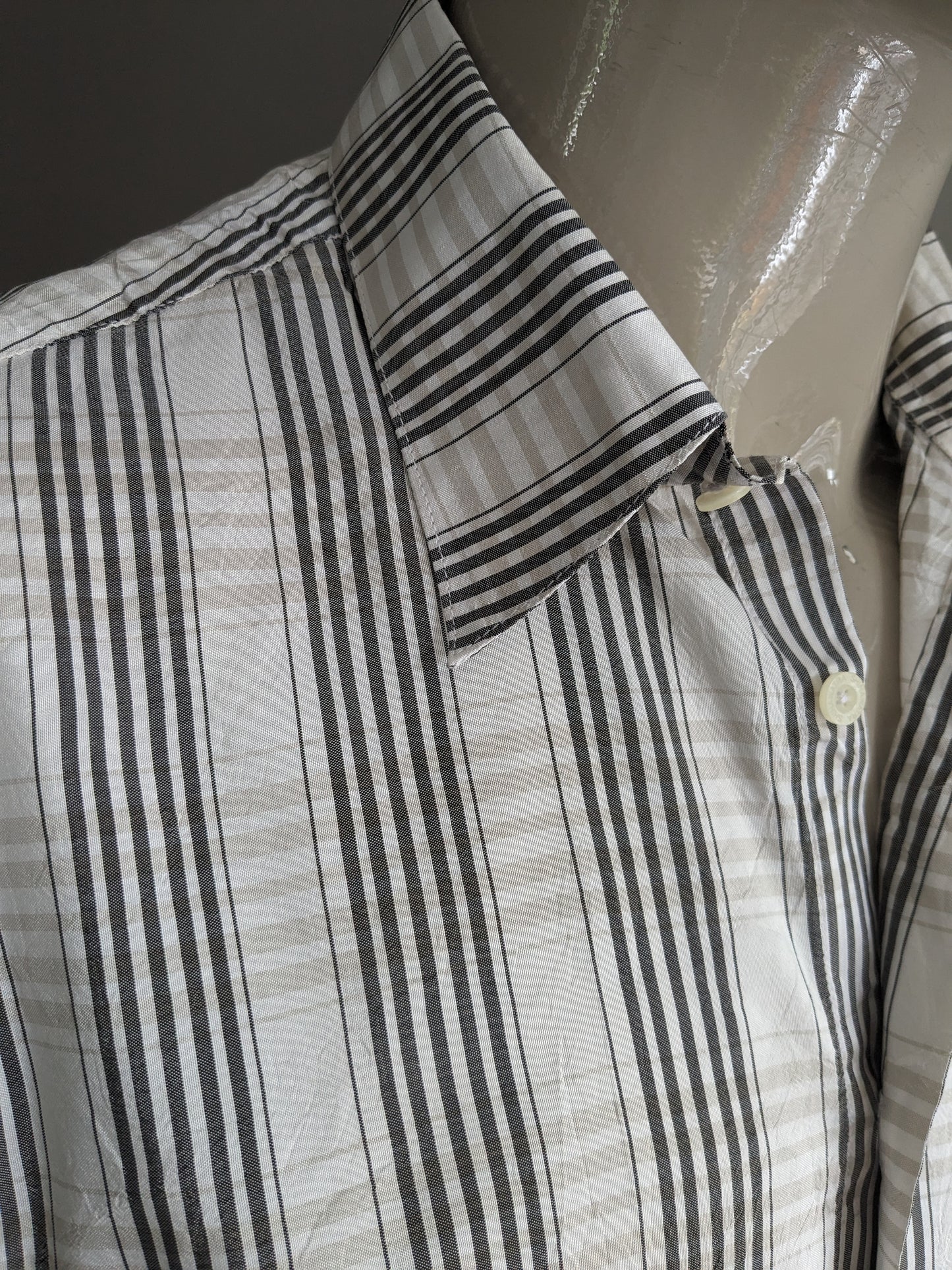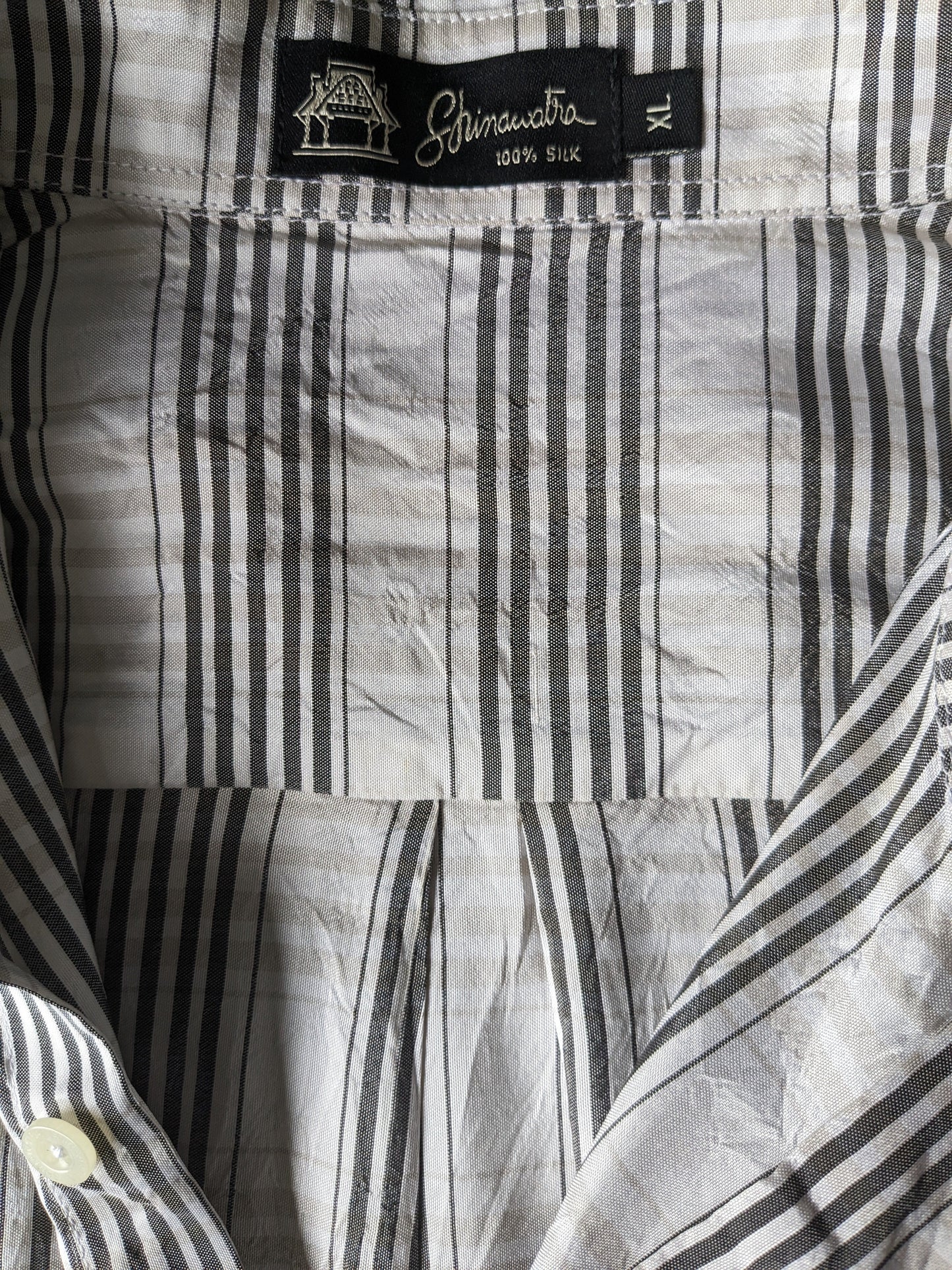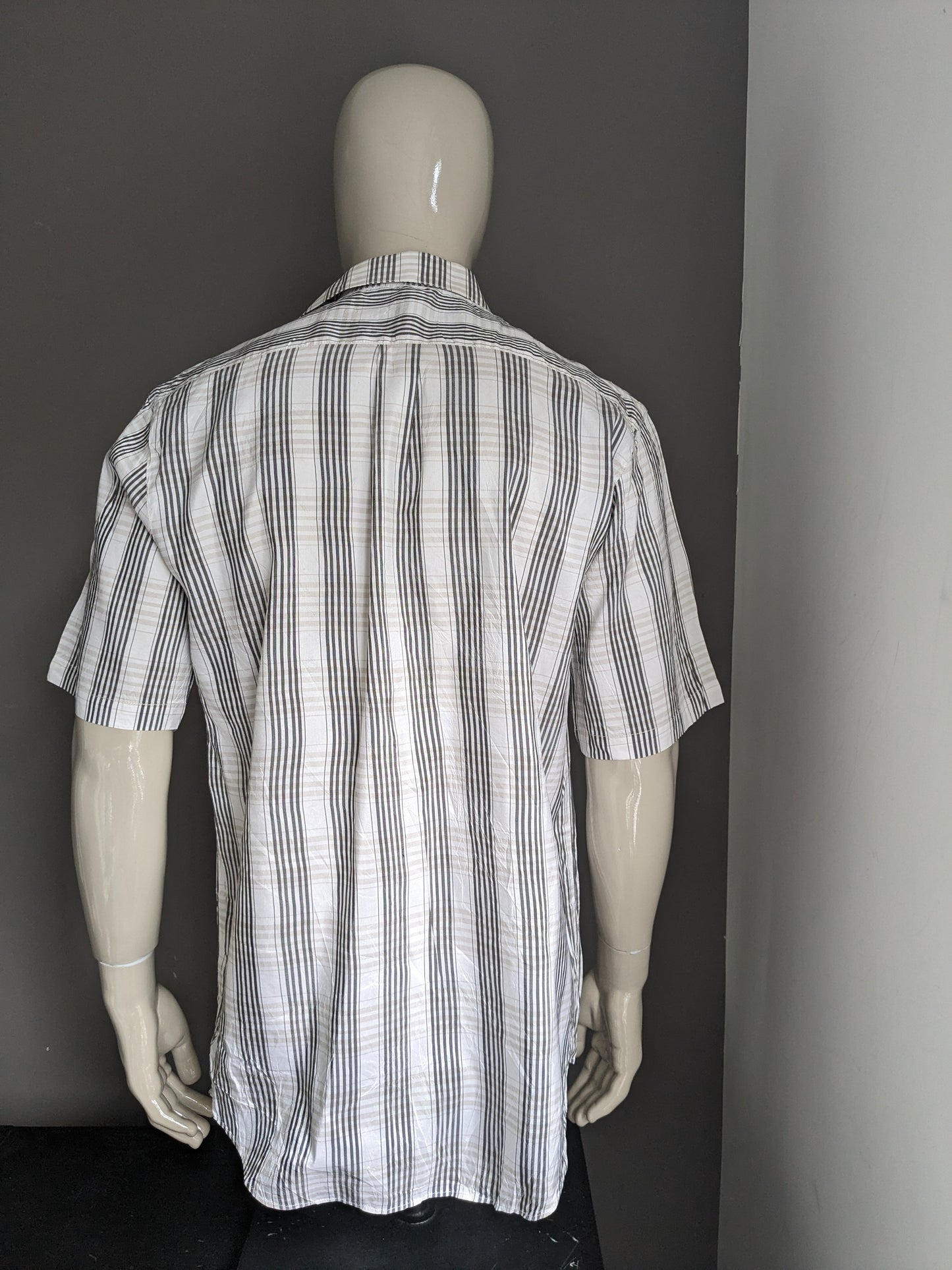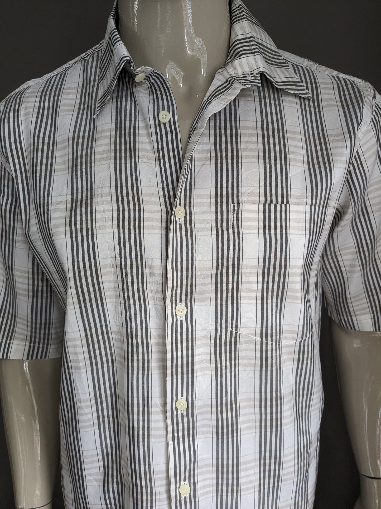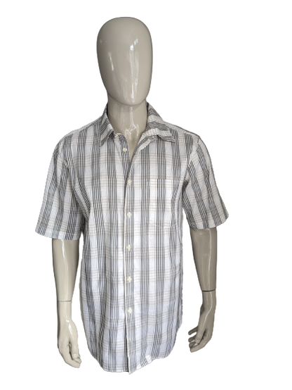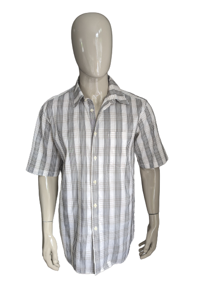 Vintage 70's Shimawatra Zijden overhemd korte mouw. Beige Zwart geruit. Maat XL. Slim Fit.