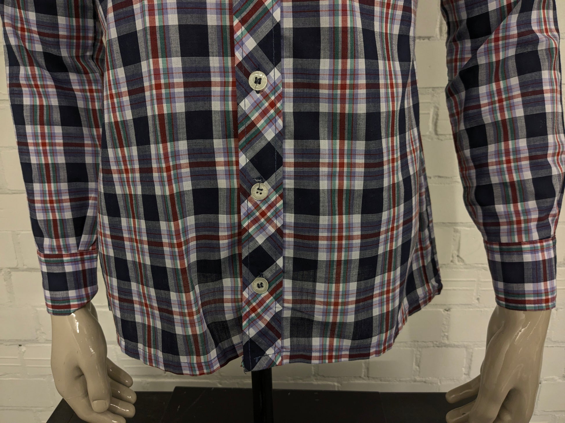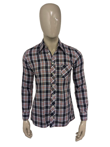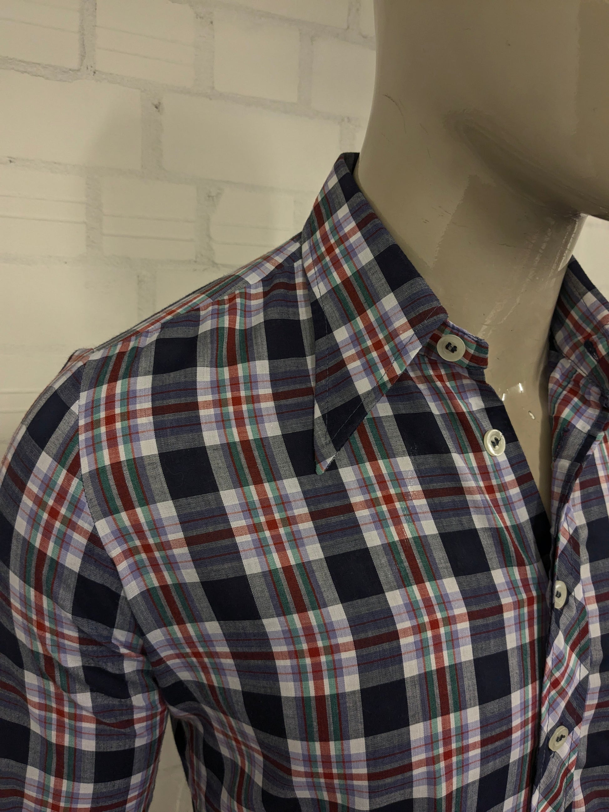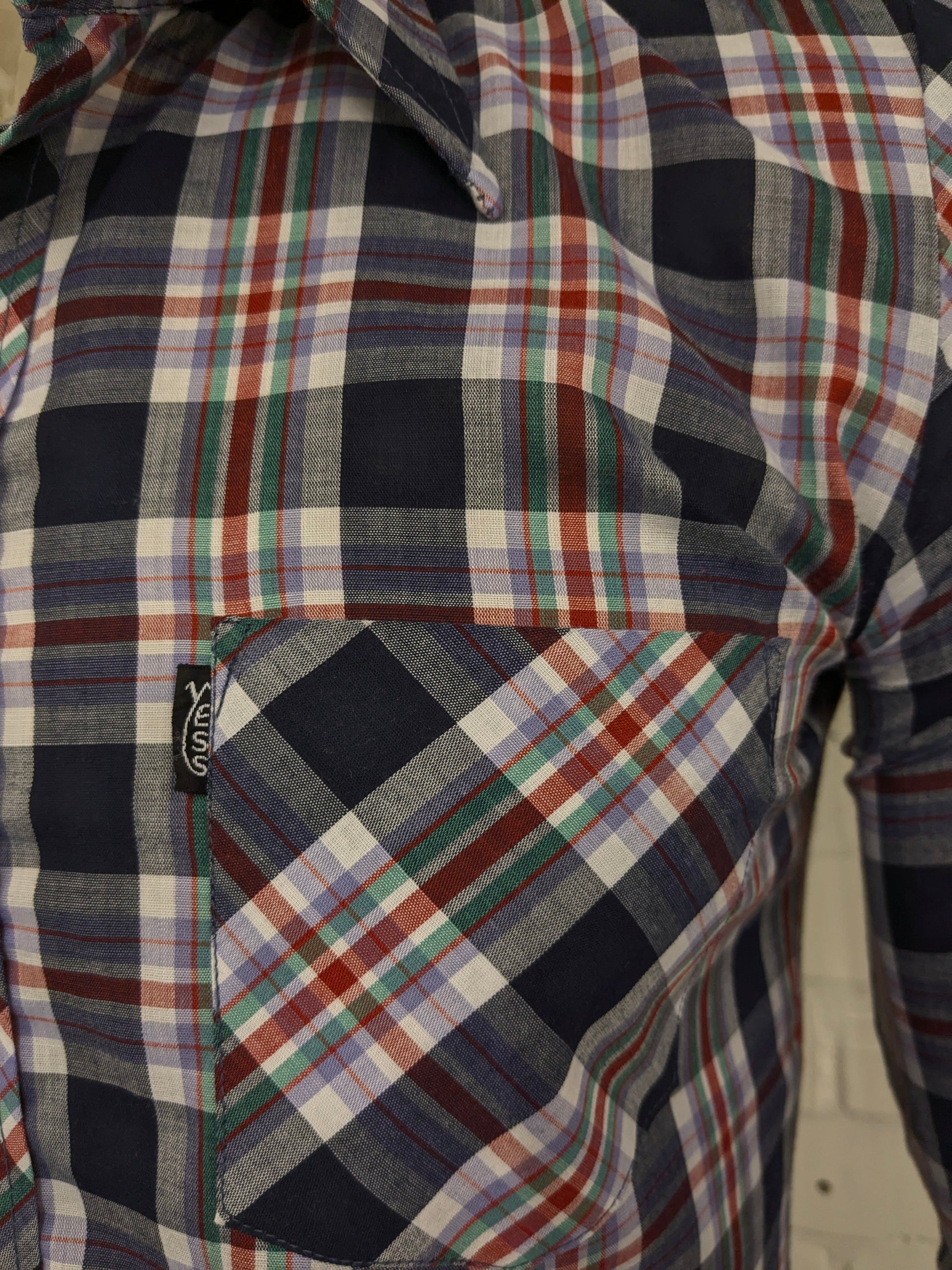 Vintage 70's Yess overhemd met puntkraag en grotere knopen. Paars Roos Groen Zwart geruit. Maat M.