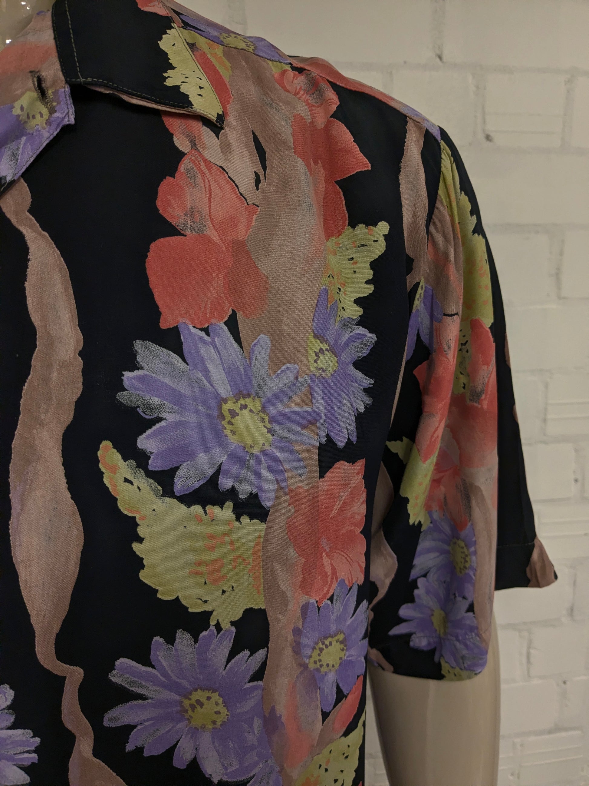 Vintage 80's / 90's No Name overhemd korte mouw. Rood Paars Groene bloemen print. Maat XL.