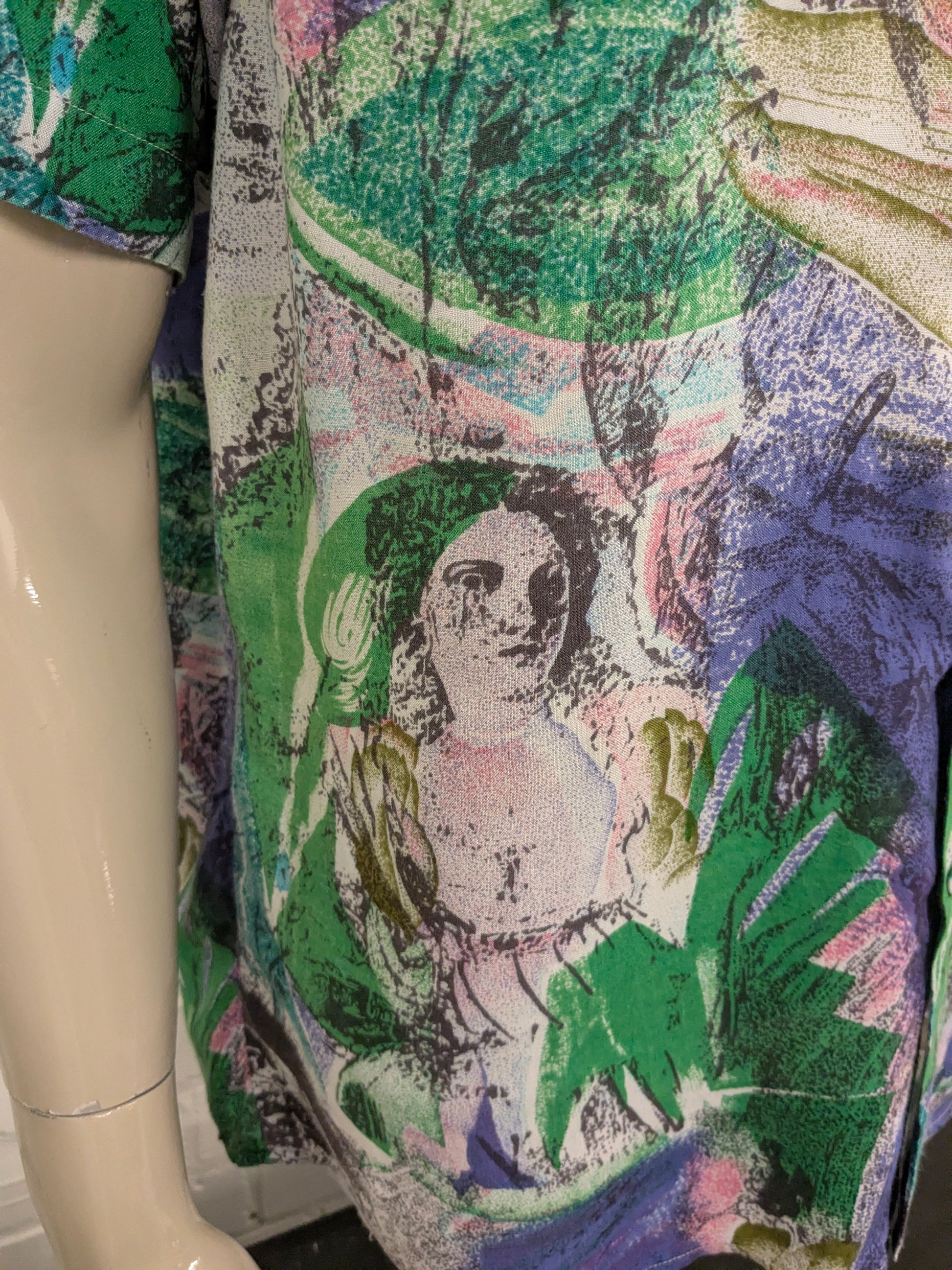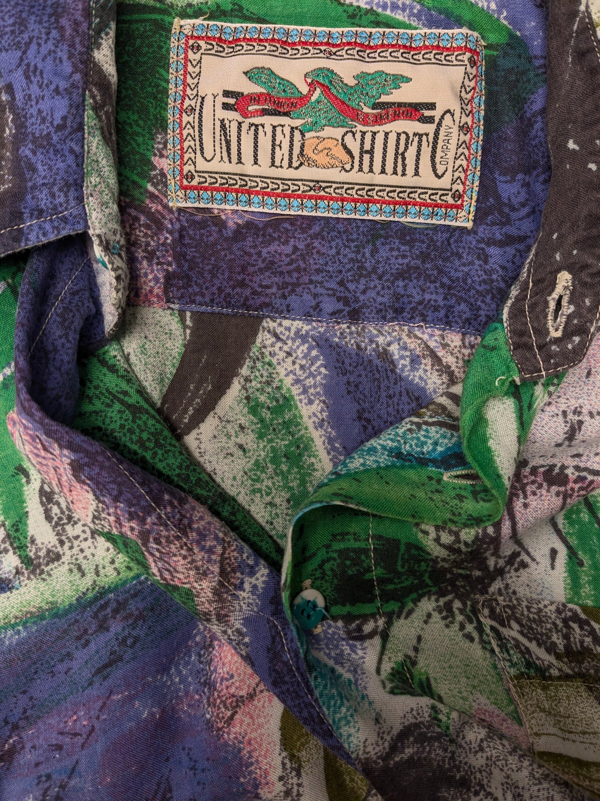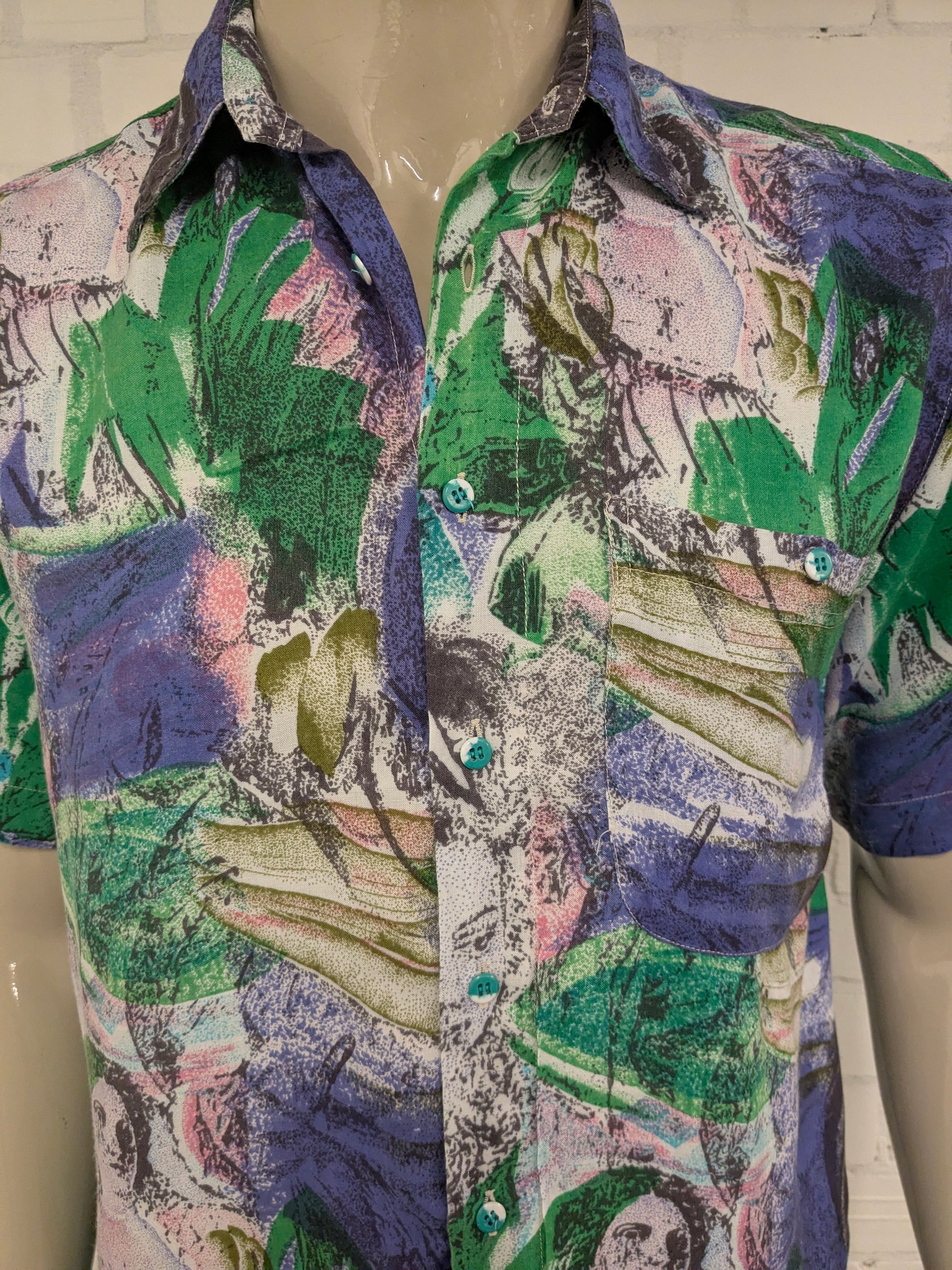 Vintage 80's / 90's United shirt overhemd korte mouw. Groen Paars Roze print. Maat L.