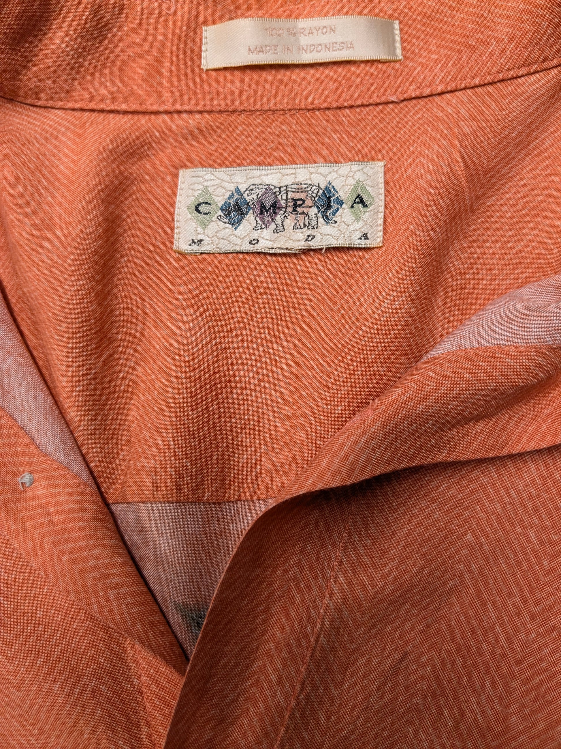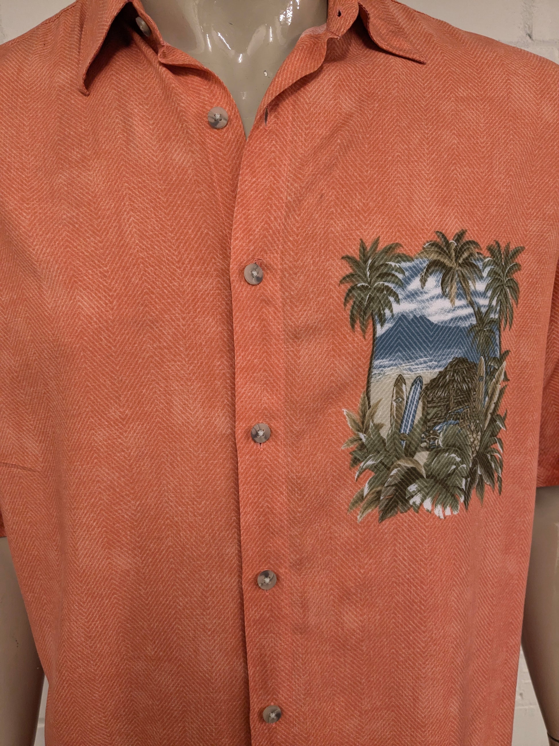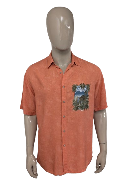 Vintage Campina overhemd korte mouw. Roze met Hawaii print. Maat L.