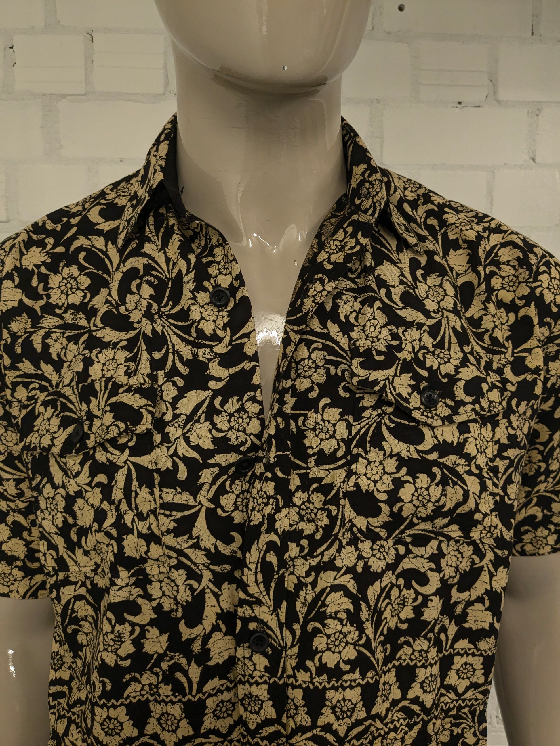 Vintage Hawaii overhemd korte mouw. Beige Bruine bloemen print. Maat L.