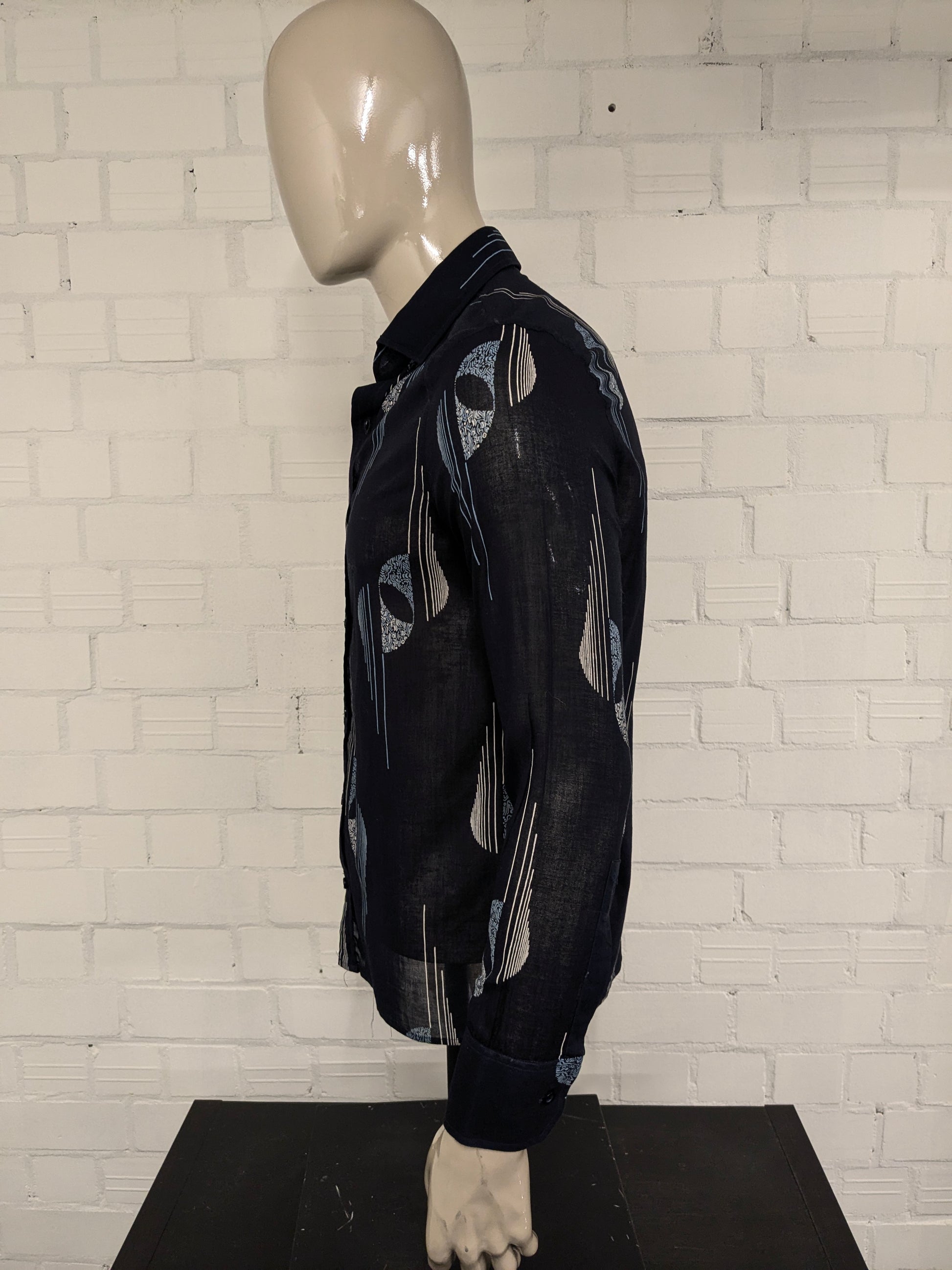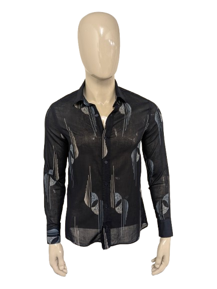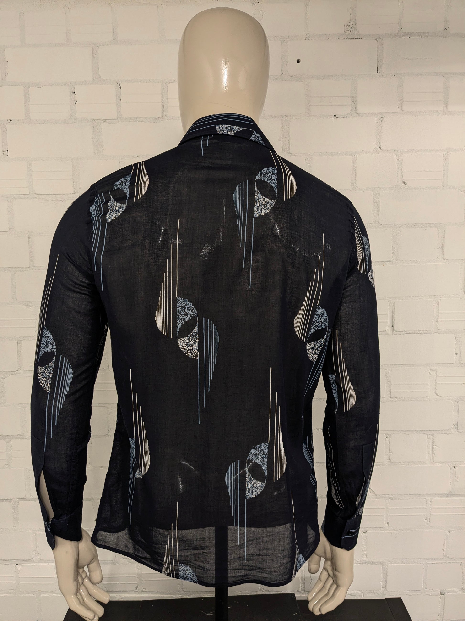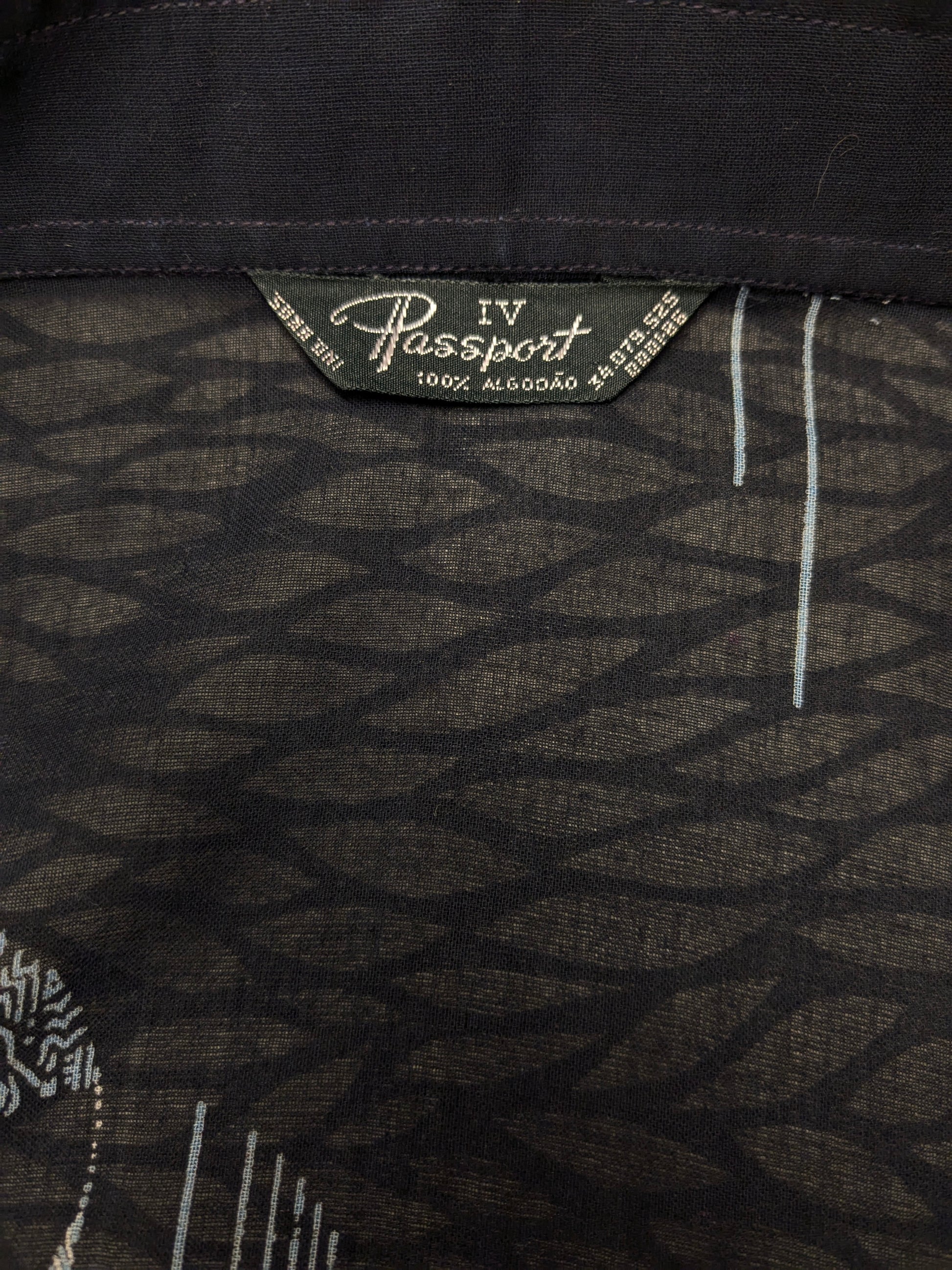 Vintage IV Passport licht doorschijnend overhemd. Zwart Blauw Beige print. Maat M.