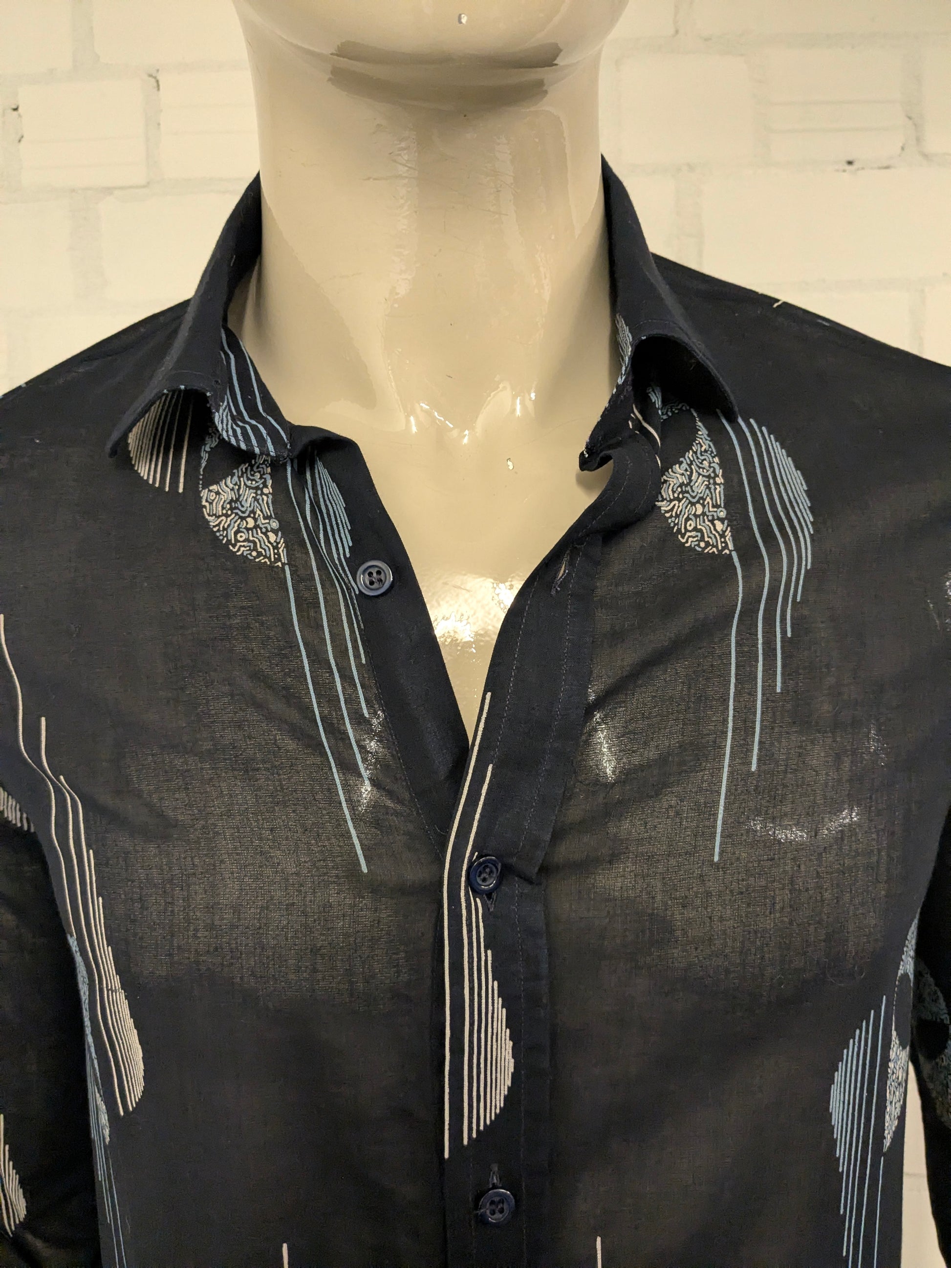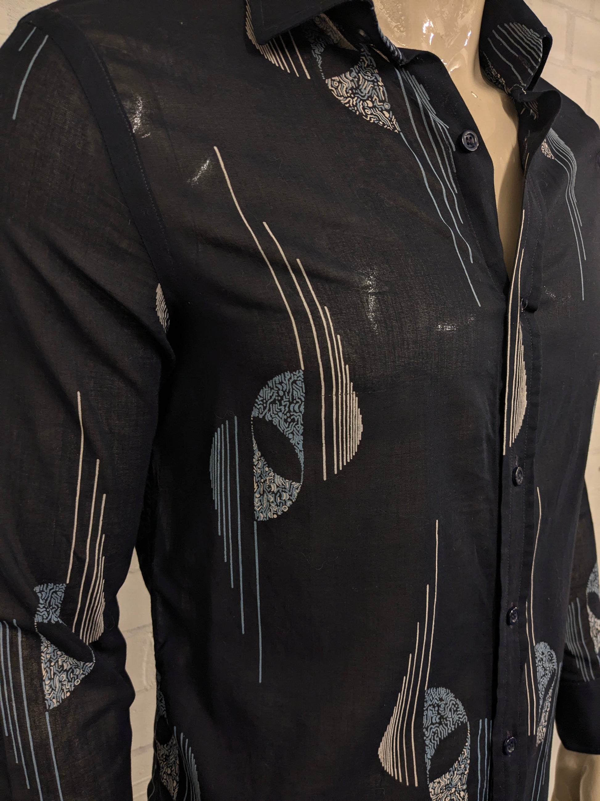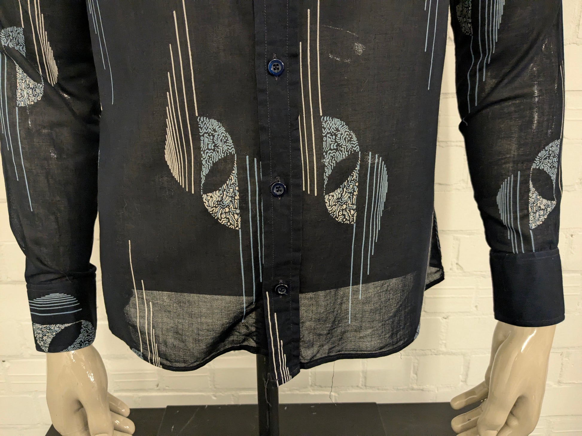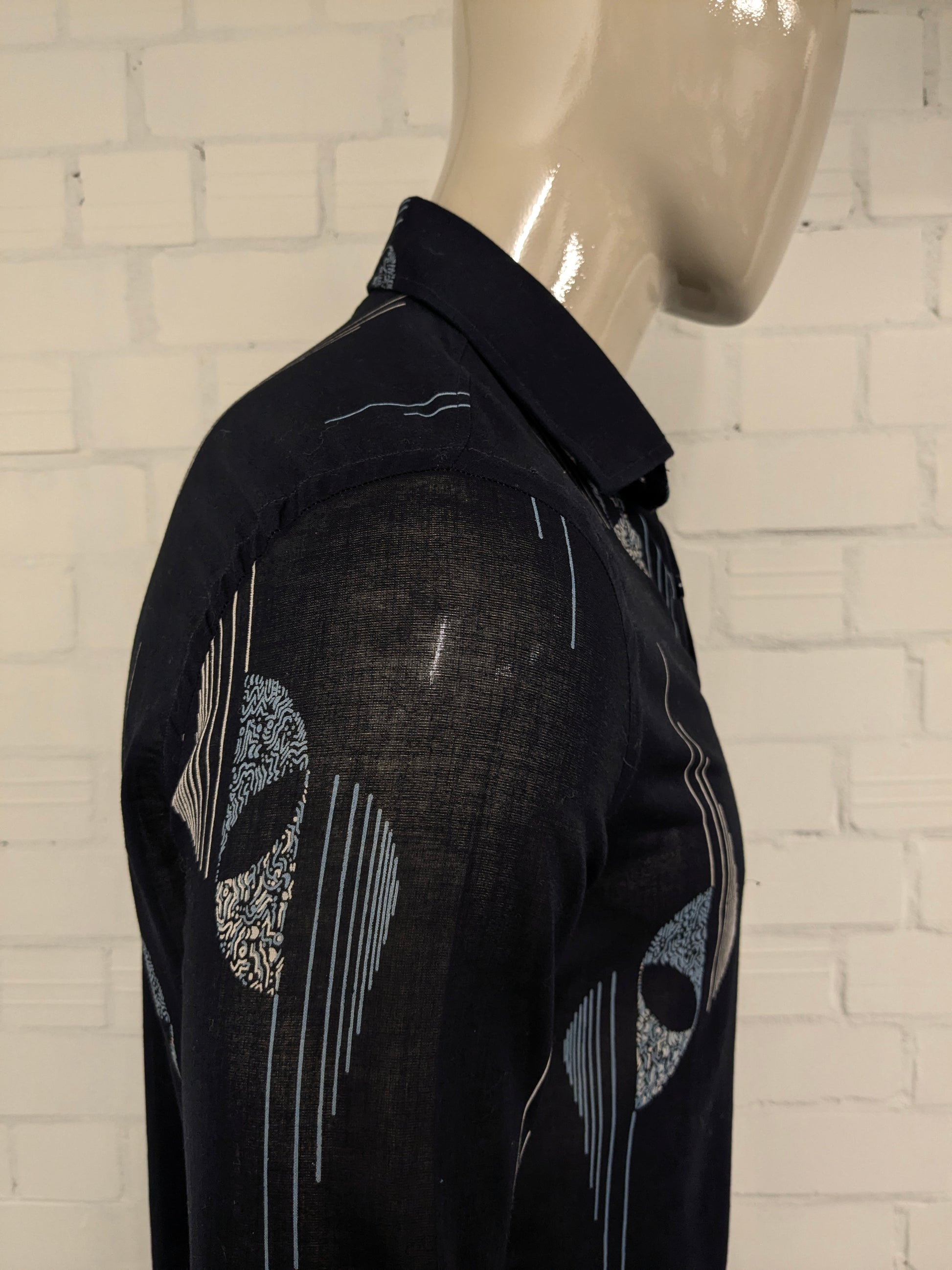 Vintage IV Passport licht doorschijnend overhemd. Zwart Blauw Beige print. Maat M.