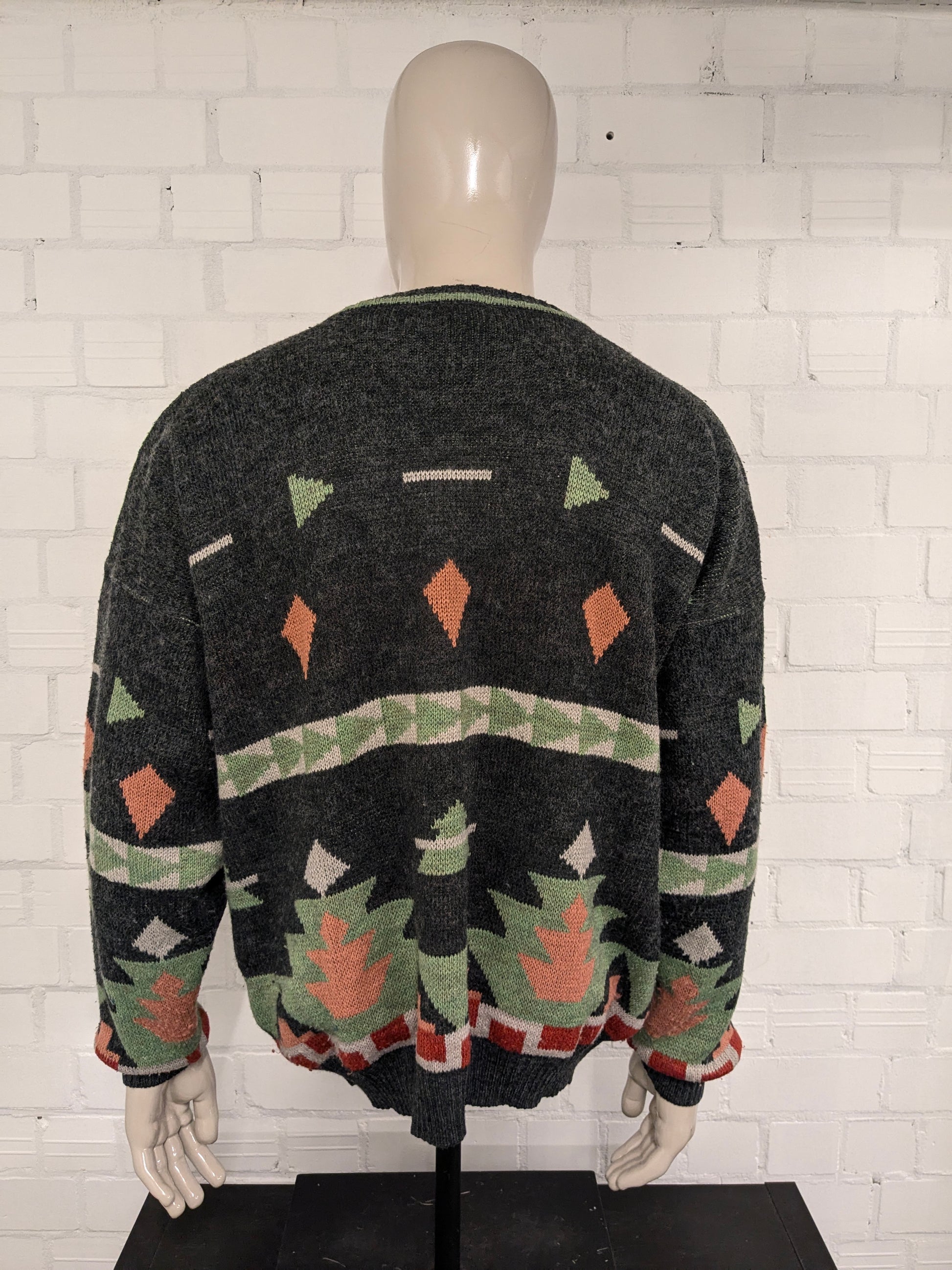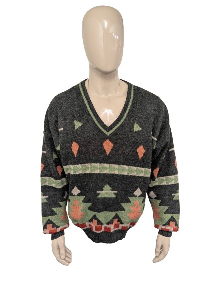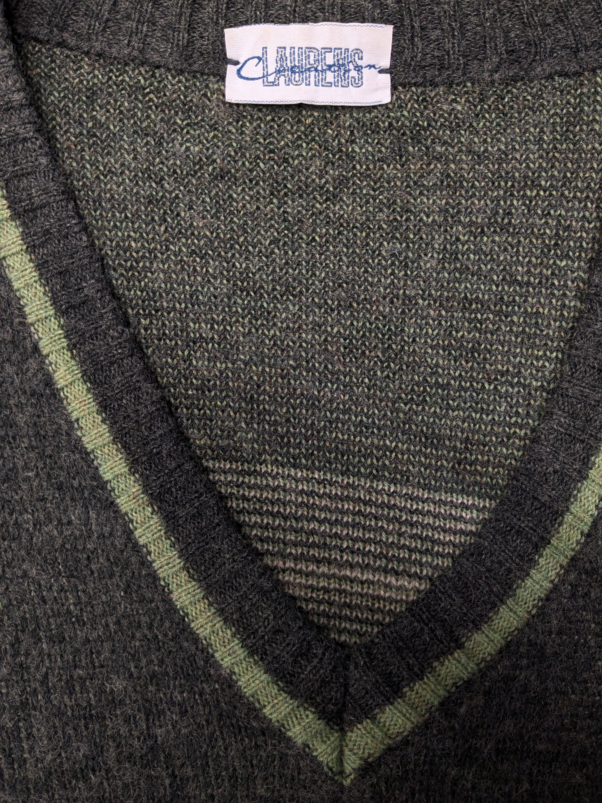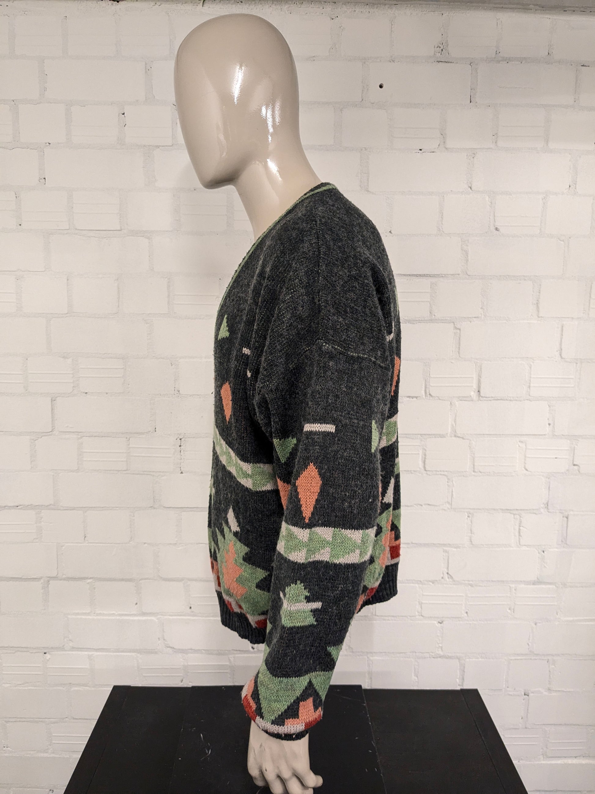 Vintage Laurens Wollen trui met V-Hals. Groen Roze Rood gekleurd. Maat XL. 30% Wol.