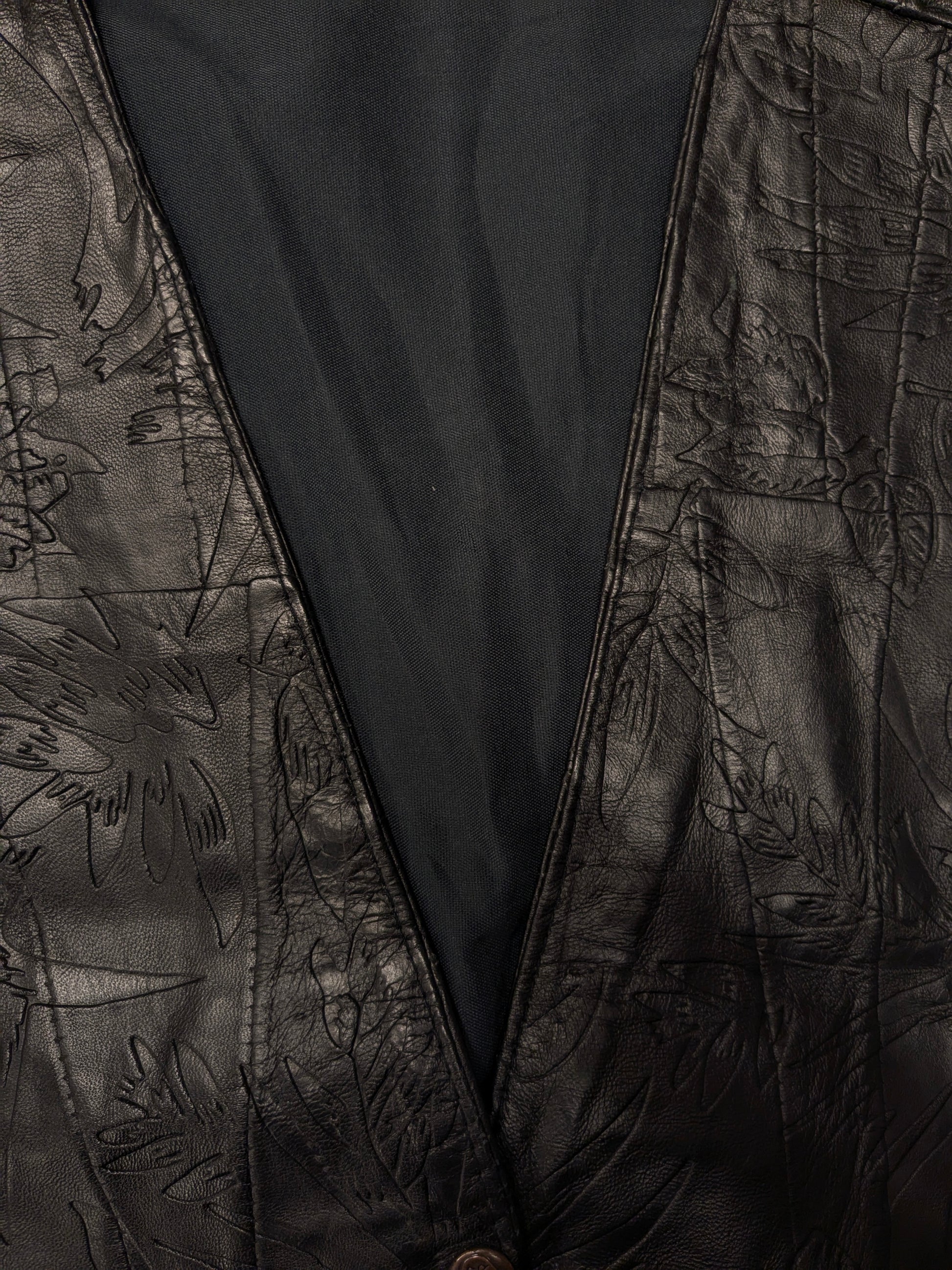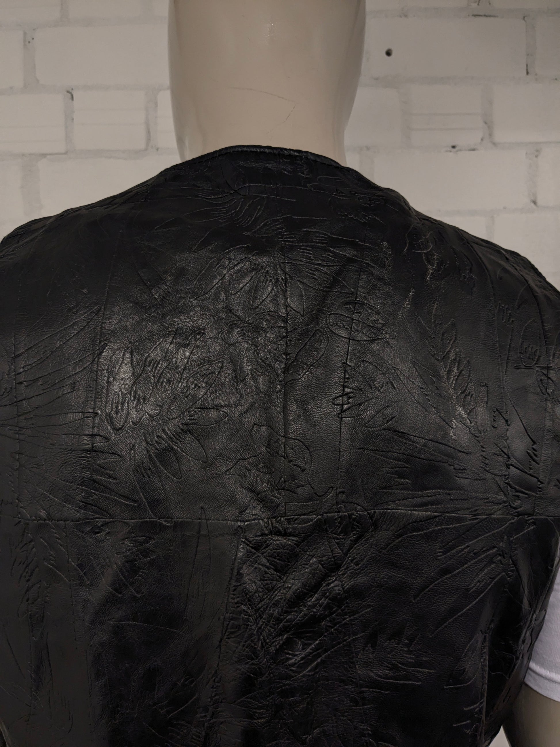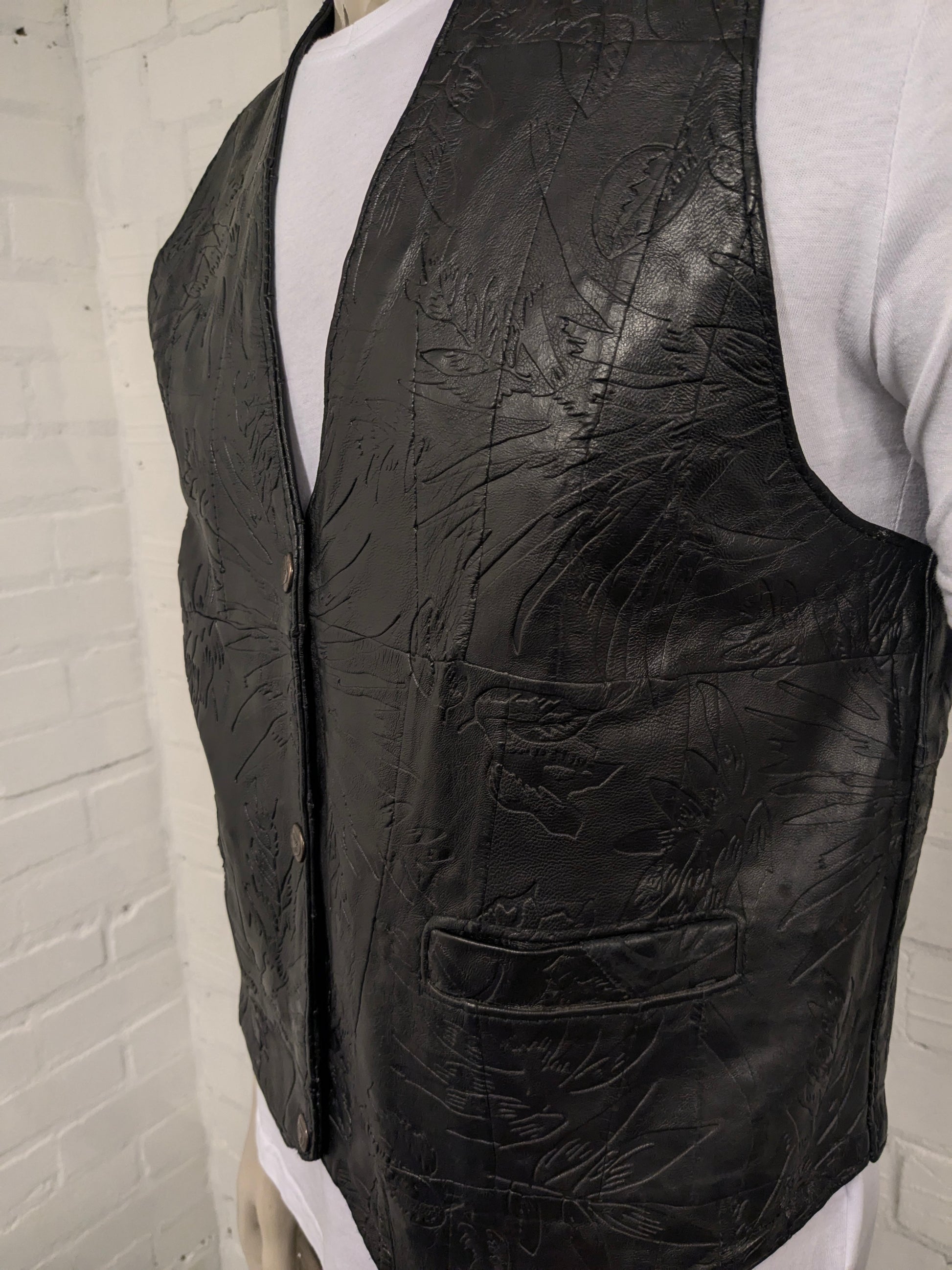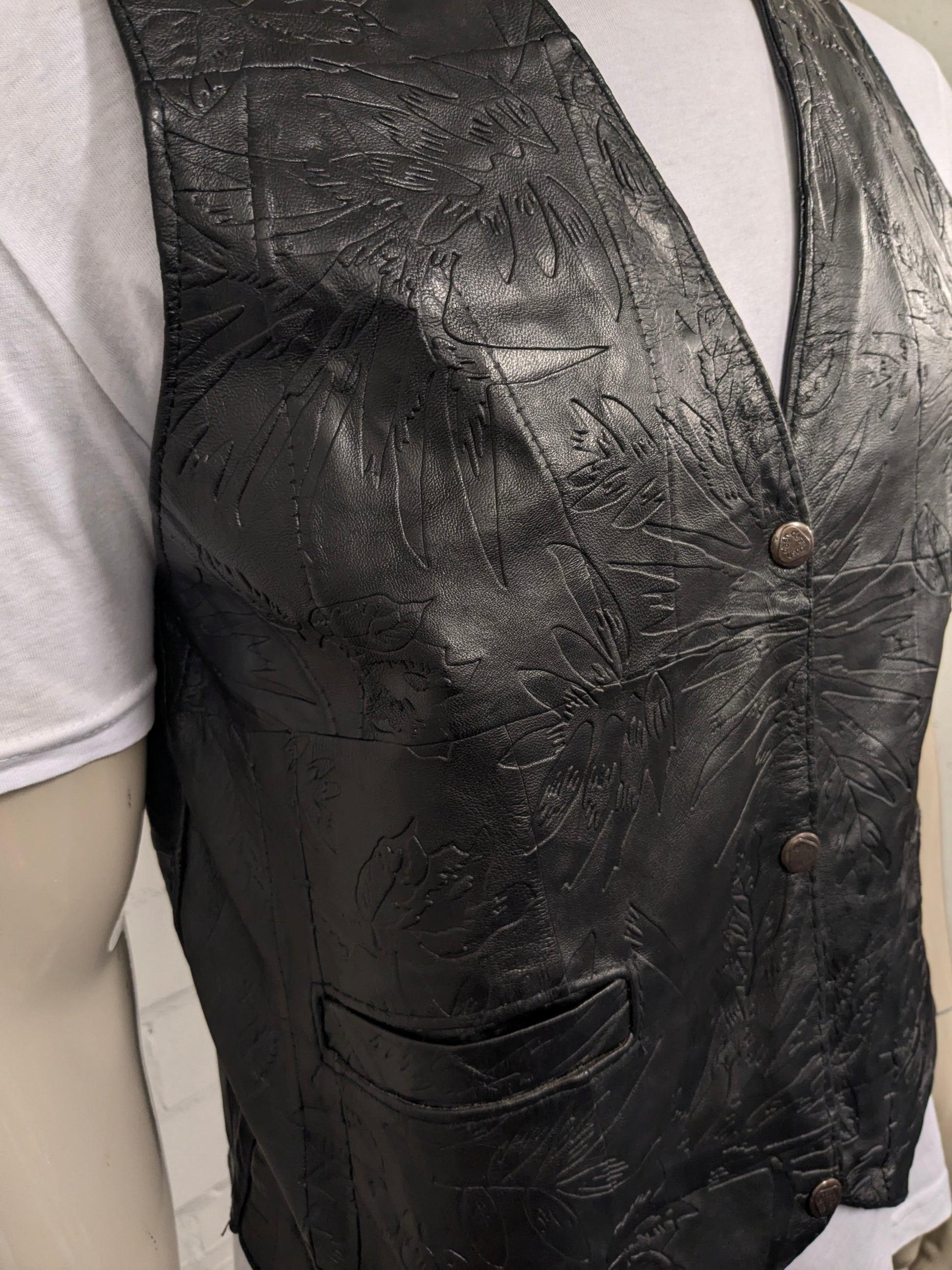 Vintage leren dubbelzijdig gilet met drukknopen. Zwart voelbaar bladmotief. Maat M.