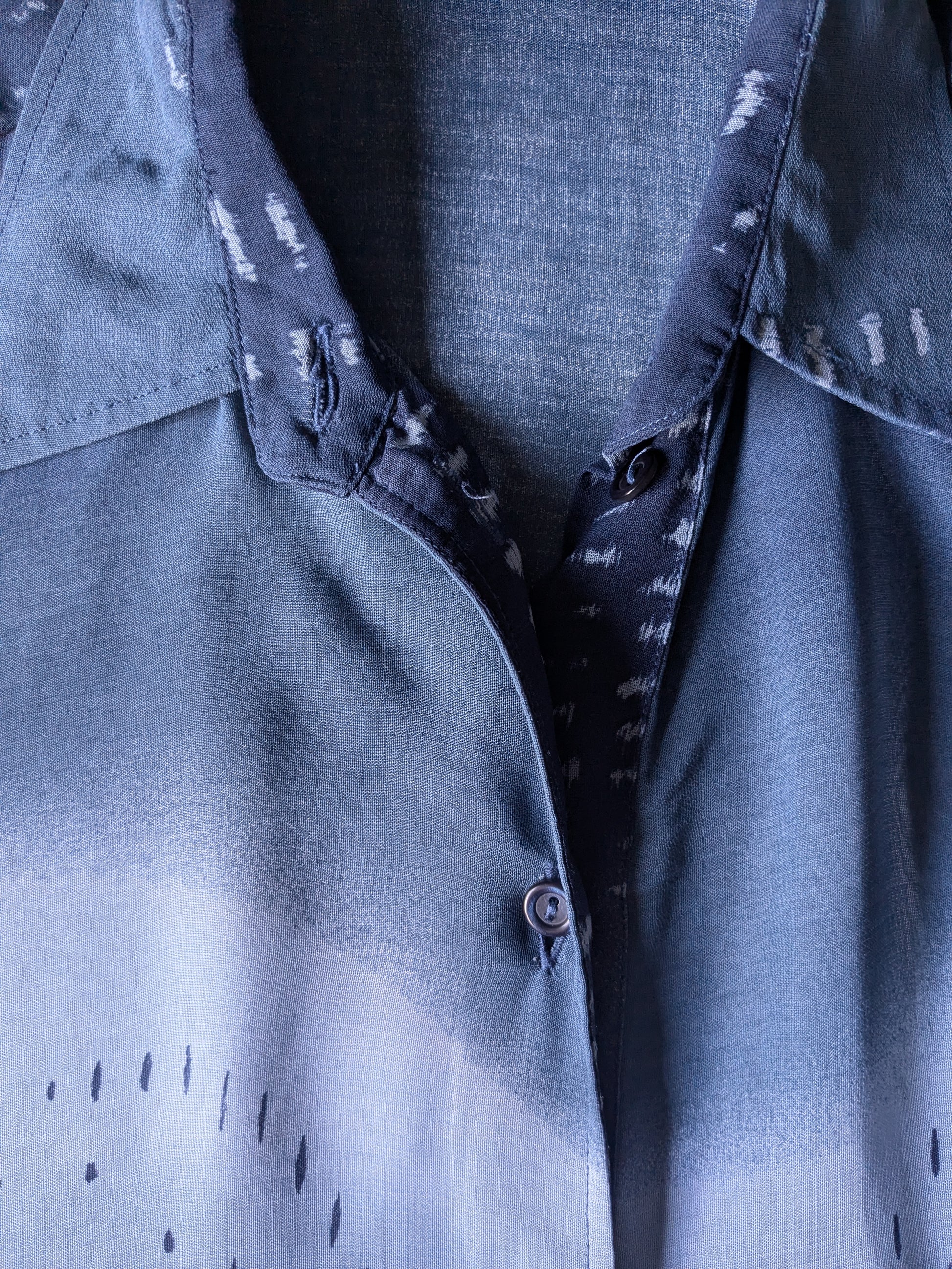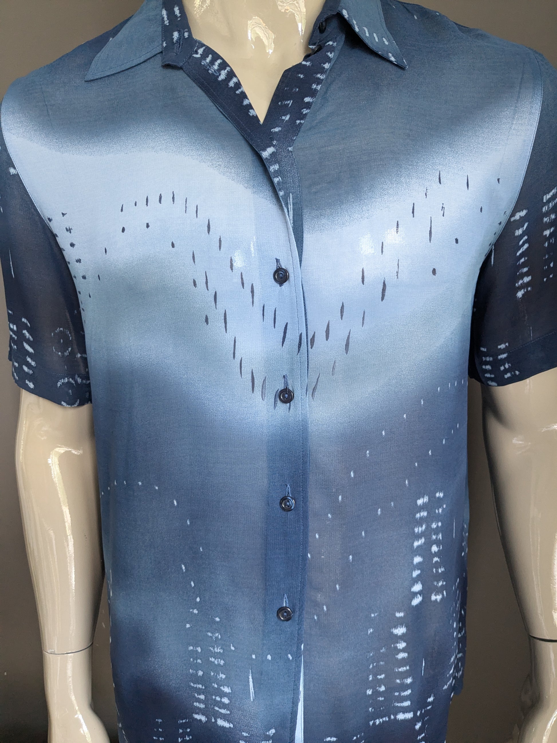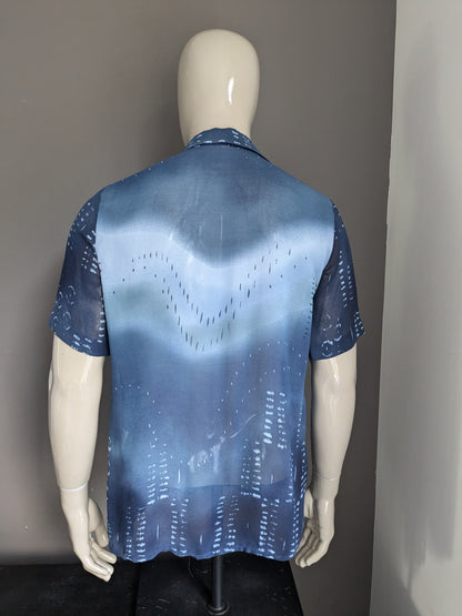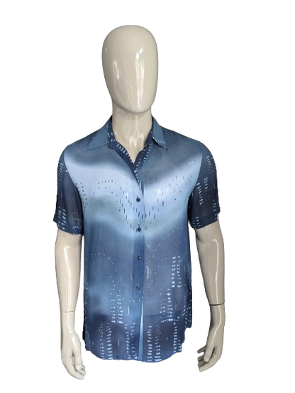 Vintage licht doorschijnend overhemd korte mouw. Blauwe print. Maat L.