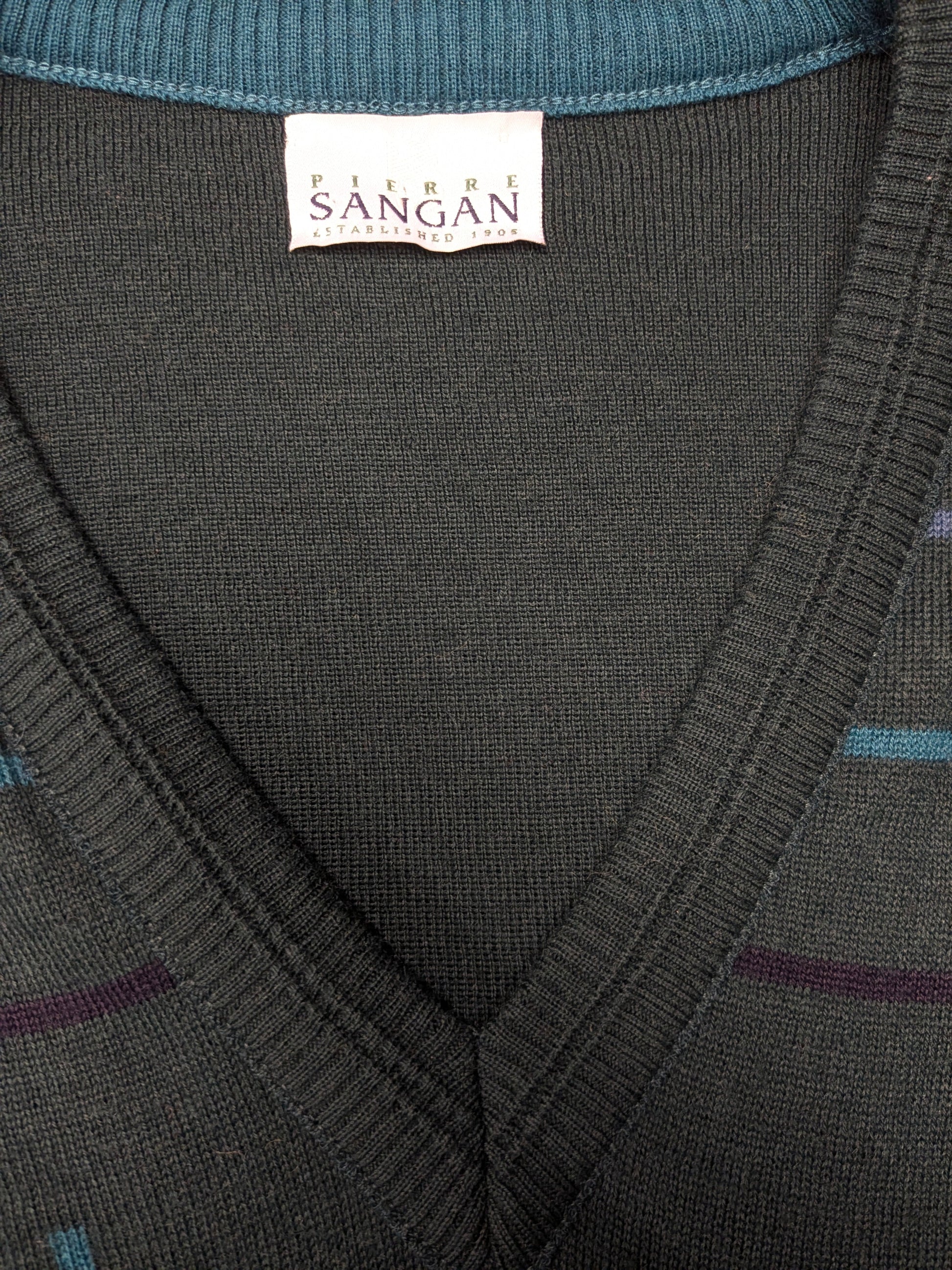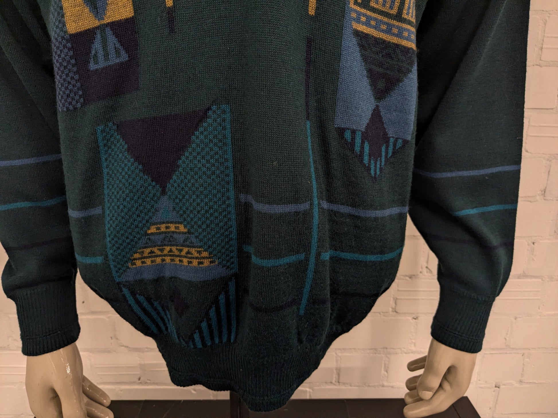 Vintage Pierre Sangan Wollen trui met V-Hals. Groen Blauw Geel gekleurd. Maat L. 50% Wol.