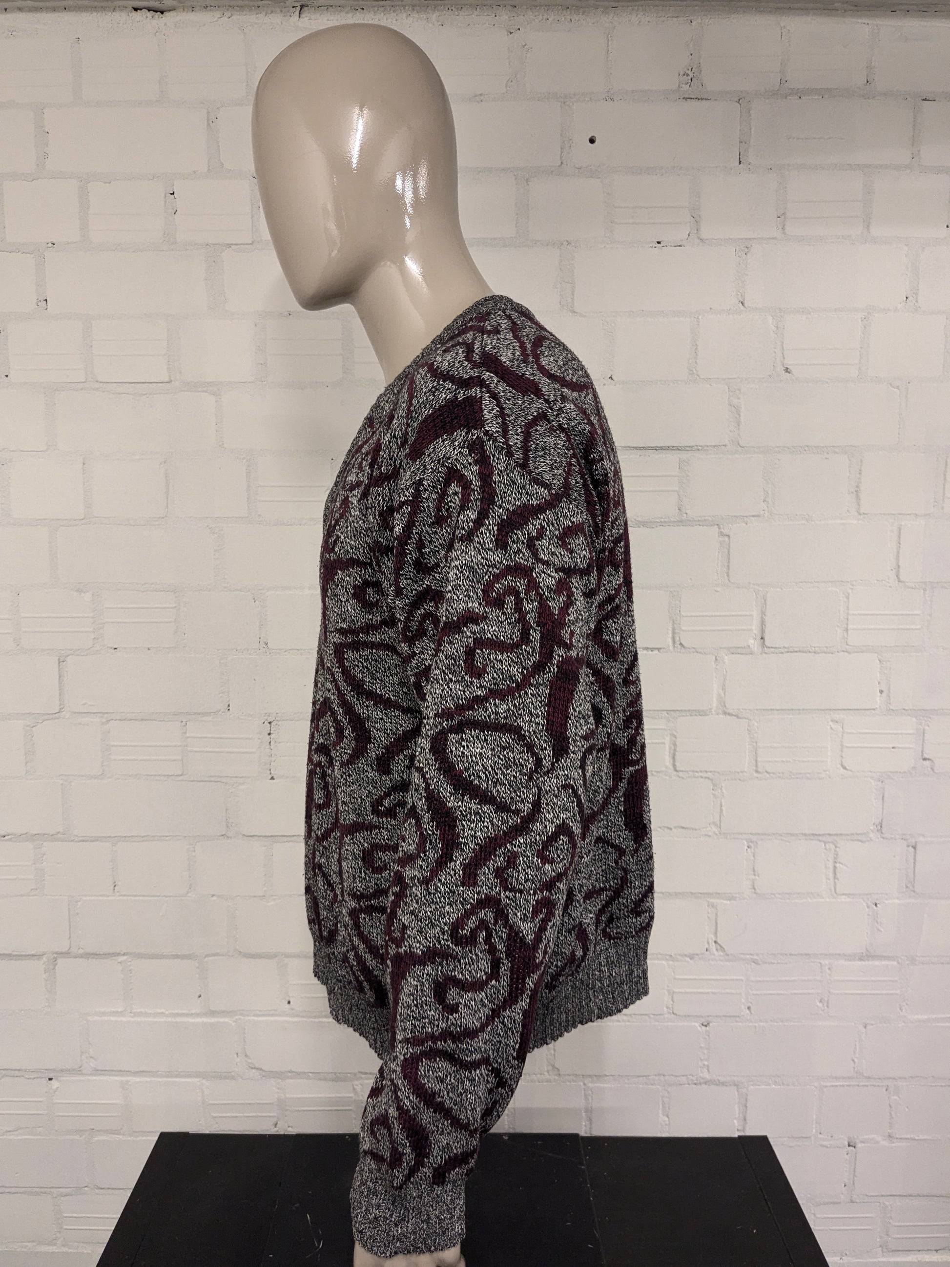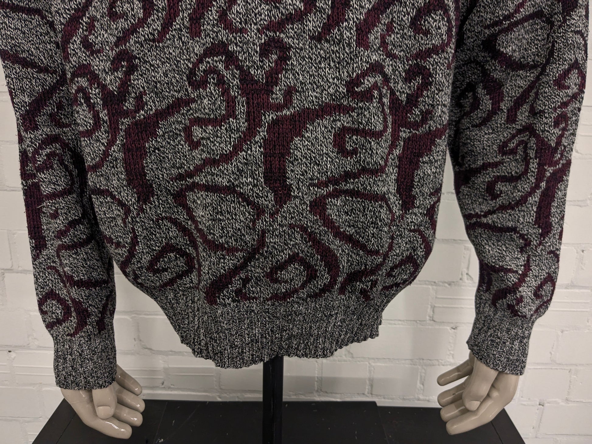 Vintage trui met V-Hals. Bordeaux Zwart Grijs gemêleerd. Maat XL.