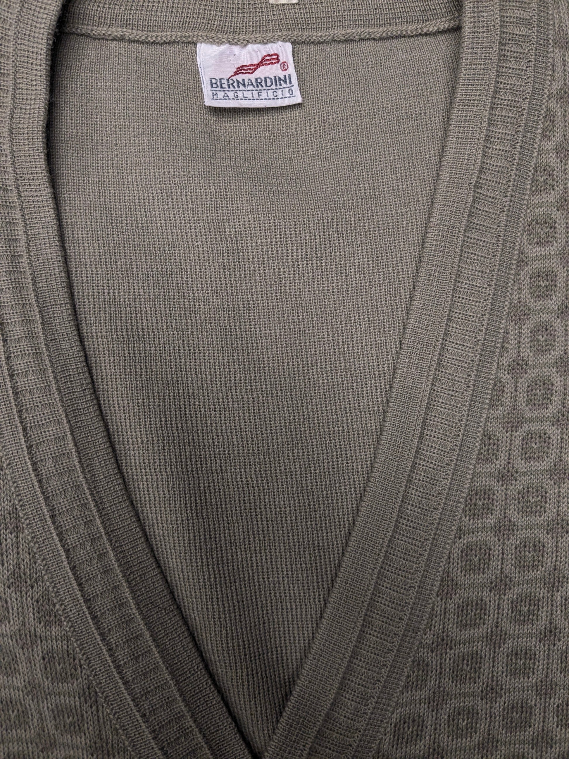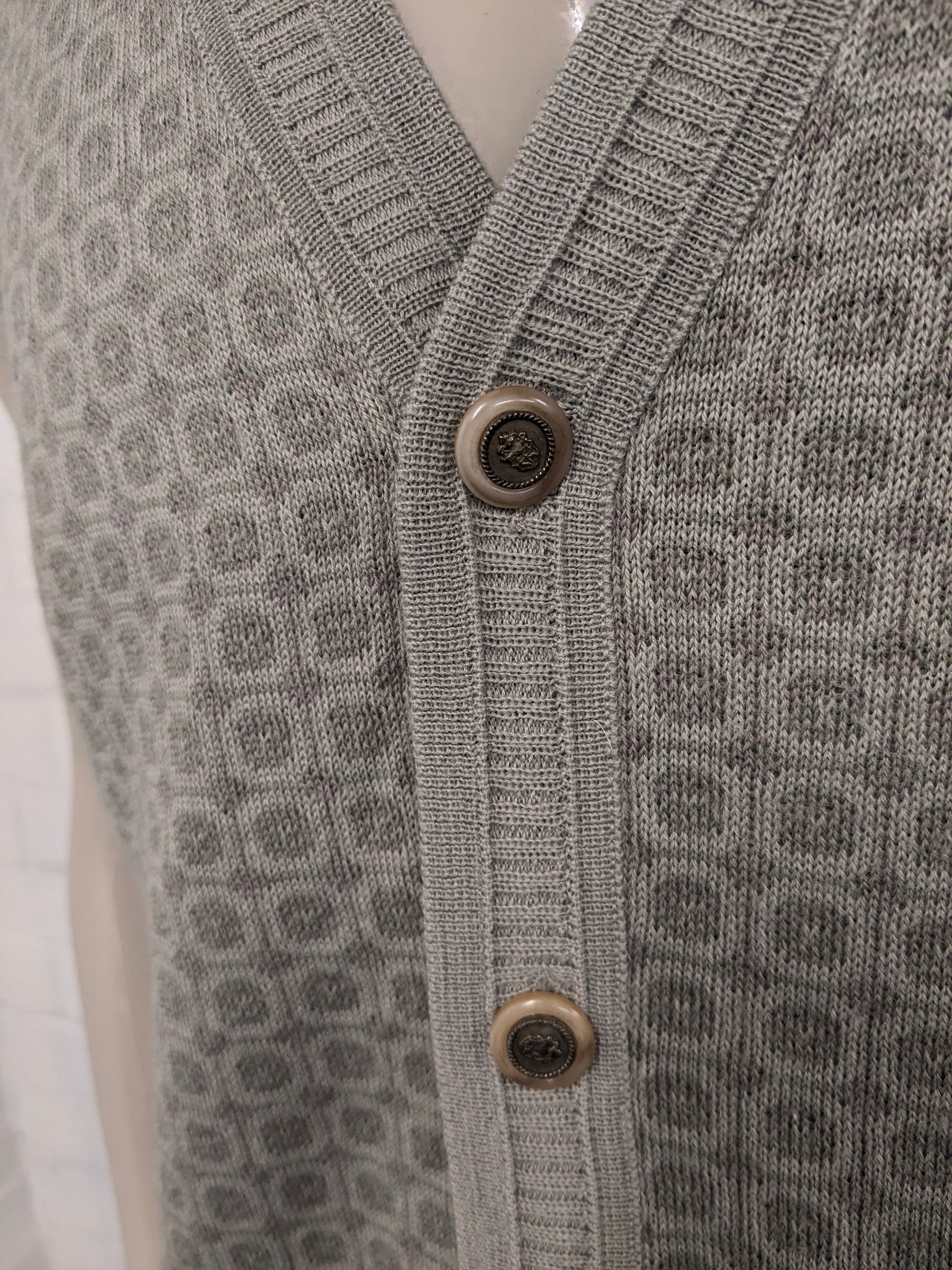 Vintage Wollen Bernardino gilet / spencer / vest met mooie knopen. Groen Lila motief. Maat M. 50% Wol.