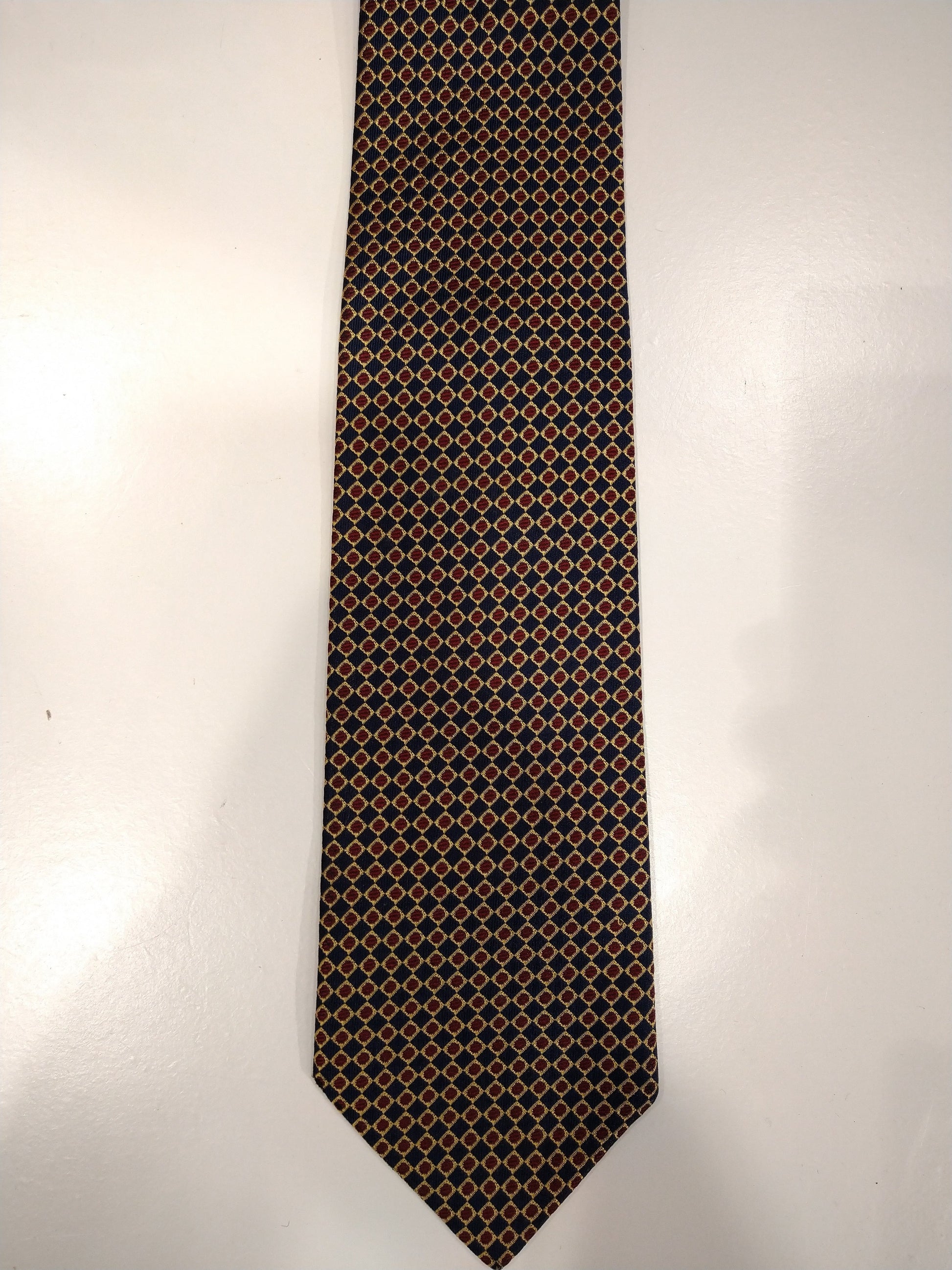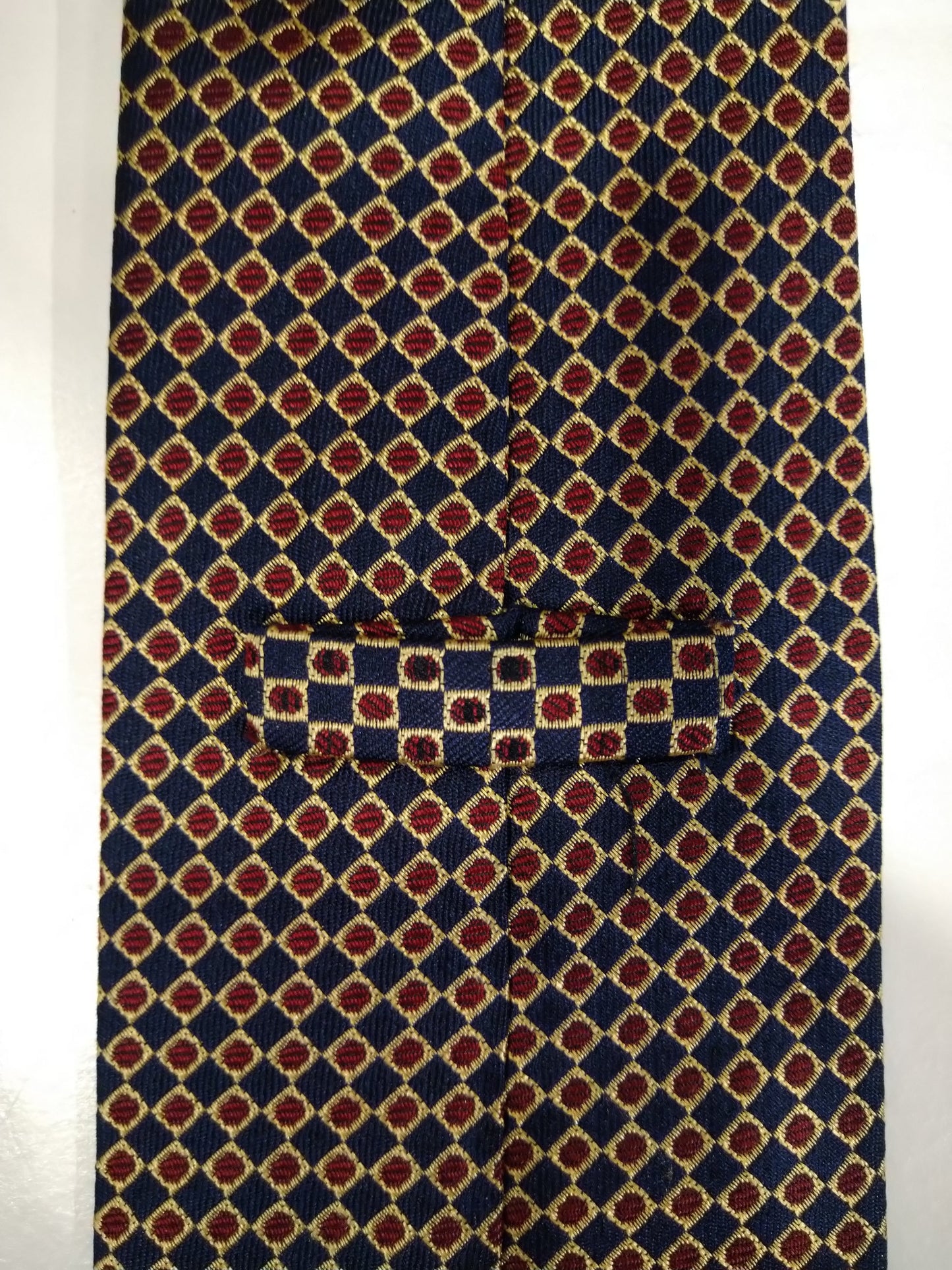 Vintage zijde stropdas. Blauw met goud / rood bolletjes motief.